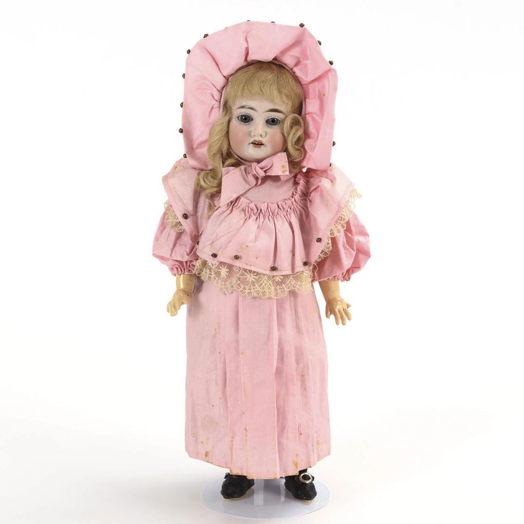 Kurbelkopf, blaue Schlafaugen, blondgelockte Mohairperücke. 9-teiliger Gliederkörper. Rosa Kleid mit Rüschen und Perlen verziert, passende Haube, schwarze Wachstuchschuhe. Kopf durchleuchtet: ohne Defekte. Kleiner Finger links fehlt, 1 Bein ohne Spannung.