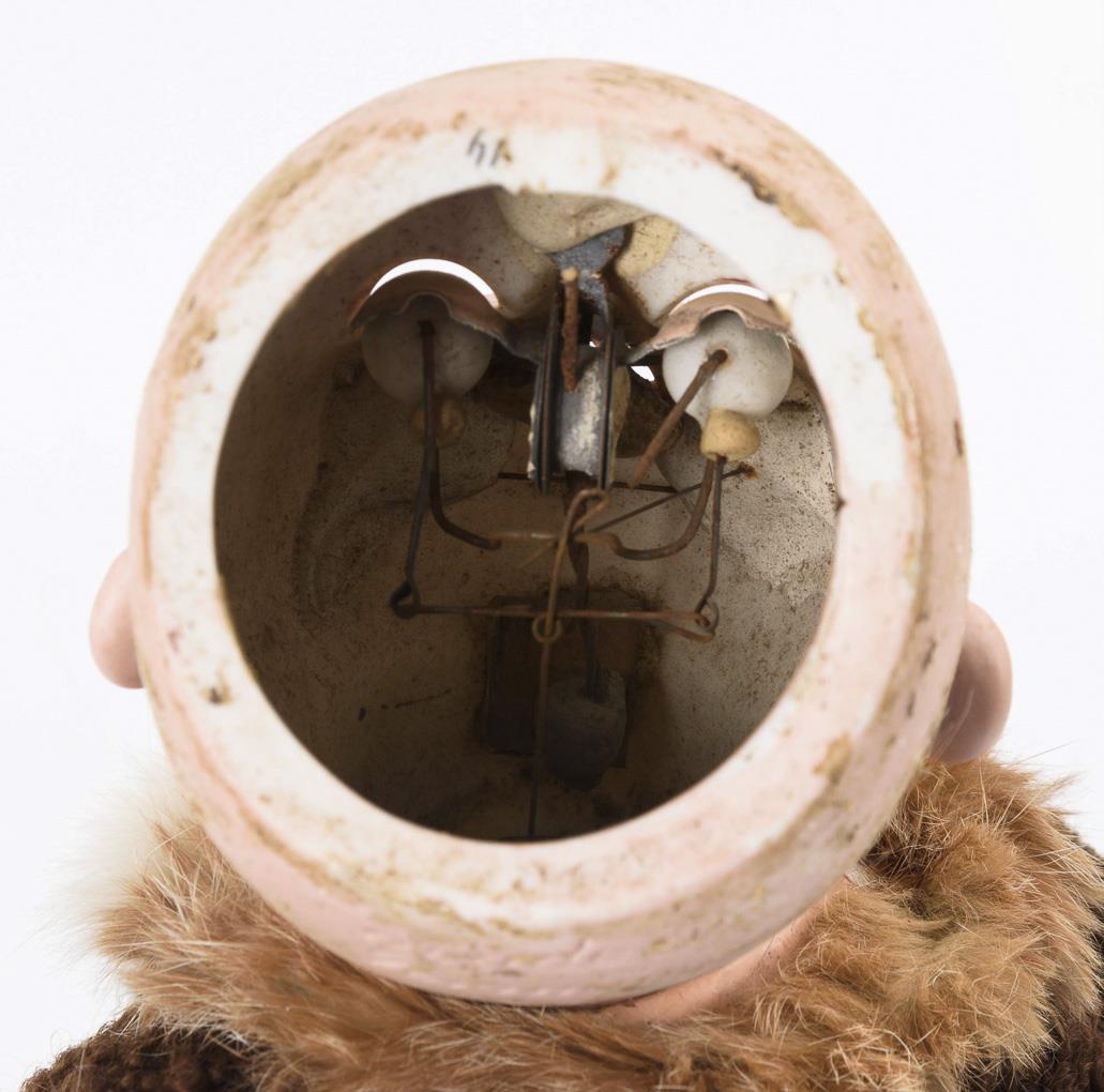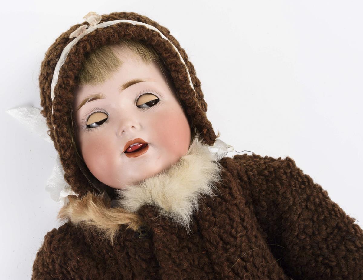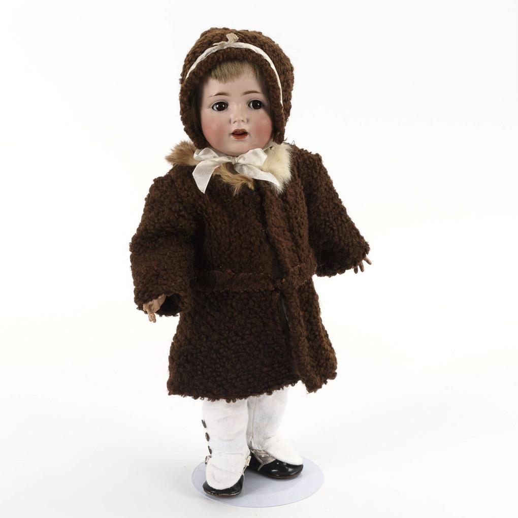 Kurbelkopf, braune Schlaf-/Schelmenaugen, offener Mund, bewegliche Zunge, blonde Echthaarperücke. 15-teiliger Toddlerkörper. Alter brauner Mantel und passende Haube in Persianer-Optik, schwarze Lackschuhe. Kopf durchleuchtet: ohne Defekte, Zunge übermalt. Linker Oberarm mit fixiertem Farbdefekt, Reparatur am rechten Fuß.