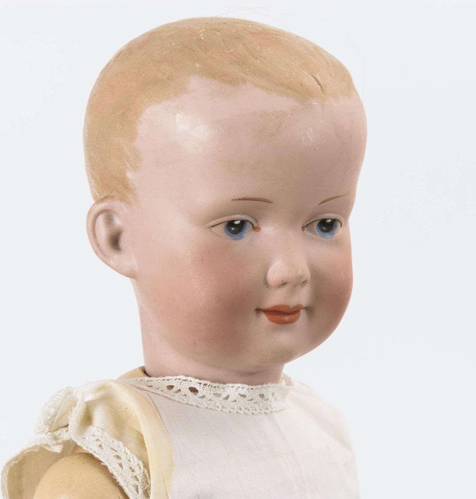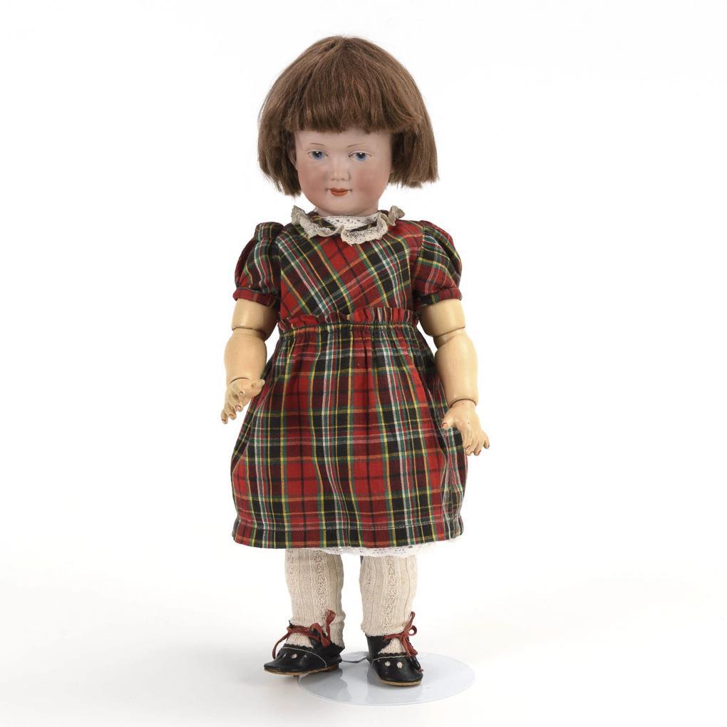 Vollkopf, gemalte blaue Intaglioaugen, modellierte Kurzhaarfrisur unter hellbrauner Mohairperücke. 17-teiliger Toddlerkörper. Altes kariertes Kleid, schwarze Wachstuchschuhe. Keine Defekte sichtbar. Körper übermalt.