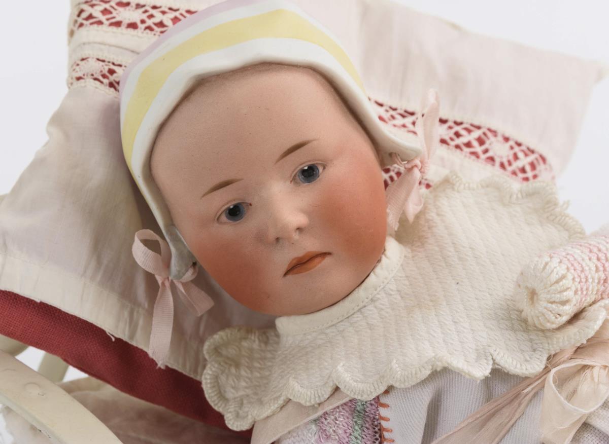 Kurbelkopf, blaue Intaglio-Augen, rot getönte Wangen, modellierte Haube mit rosa Schleifen. 5-teiliger Sitzbabykörper. Rosa Strampler, weiße Schürze, Lätzchen. Dazu weiß nachlackiertes Eisenbett (L 38,5 cm). Rechte Ecke der Haube repariert, Hände mit Reparaturspuren.