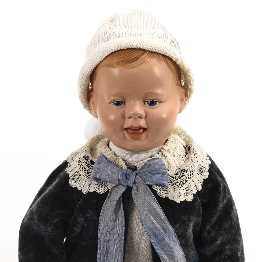 Kleine Puppe mit sehr seltenem Einbindekopf, gemalten blauen Augen, lachendem Mund und gemalten blonden Haaren. Stoffkörper mit Gliederarmen. Blauer Samtanzug nachgenäht, weiße Mütze. Haare partiell retuschiert, 1 Auge übermalt, kleine Risse an Mund, Wange und Haarboden, im Mund winziger Ausbruch.