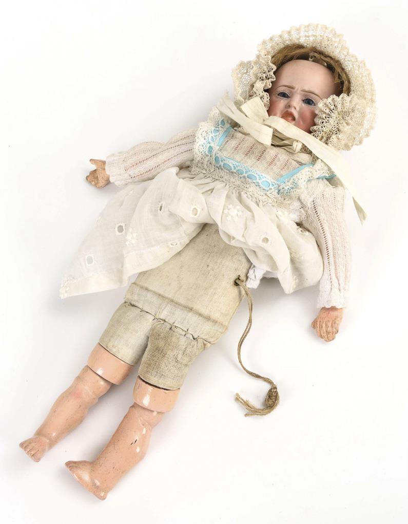 Drehbarer Biskuitkopf mit Brustplatte aus Masse: schlafend, weinend und lachend. Pappkörper mit intakter Zugstimme, Gliederarmen und -Beinen, Oberschenkel aus Stoff. Weißes Kleid, Haube, dazu Steckkissen. Keine Defekte sichtbar.
