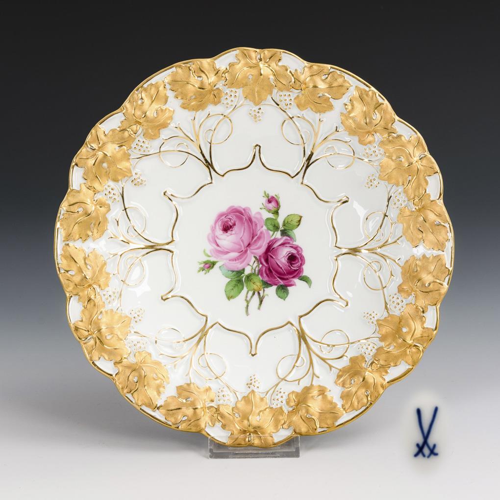 Schale mit Weinlaubrelief und einem Rosenbukett im Spiegel.