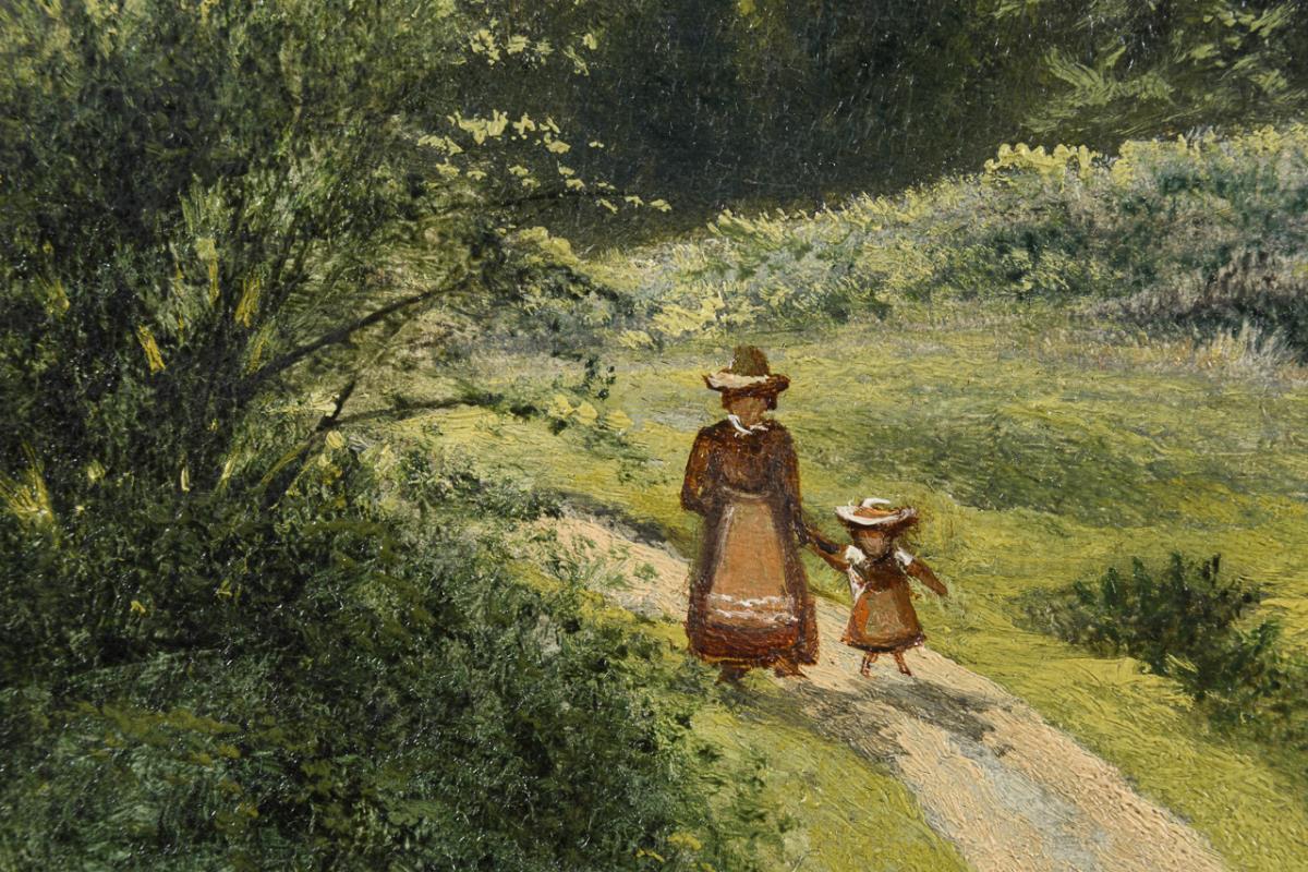 Bergige Sommerlandschaft mit Schafen auf der Weide sowie Mutter und Kind im Sonnenschein.