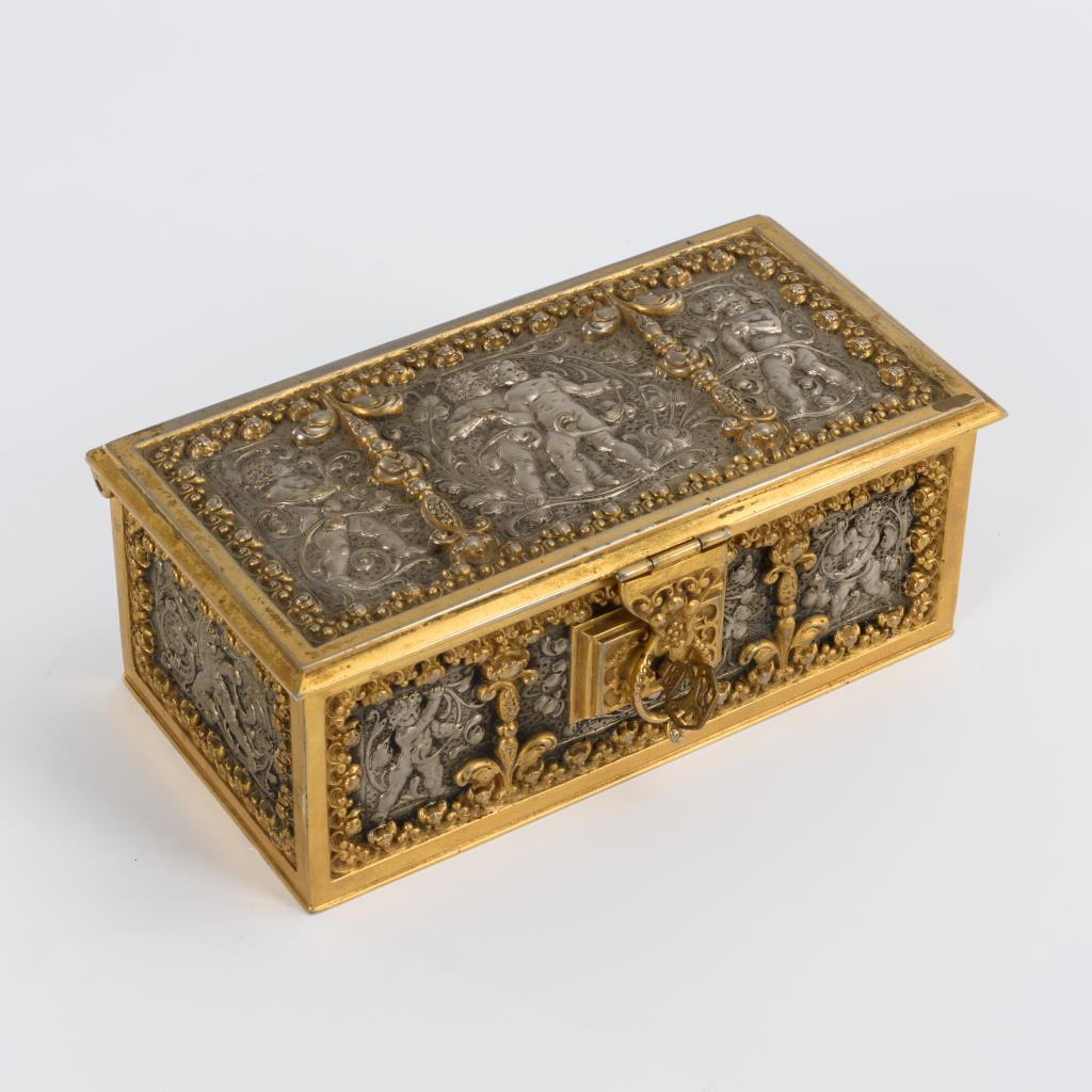 Allseits und auf dem Scharnierdeckel silberfarbene Puttenreliefs in reicher floraler Rahmung sowie Überfallbügel am Schloss. Original-Schlüssel mit Firmen-Emblem und "ES". Minimal berieben.