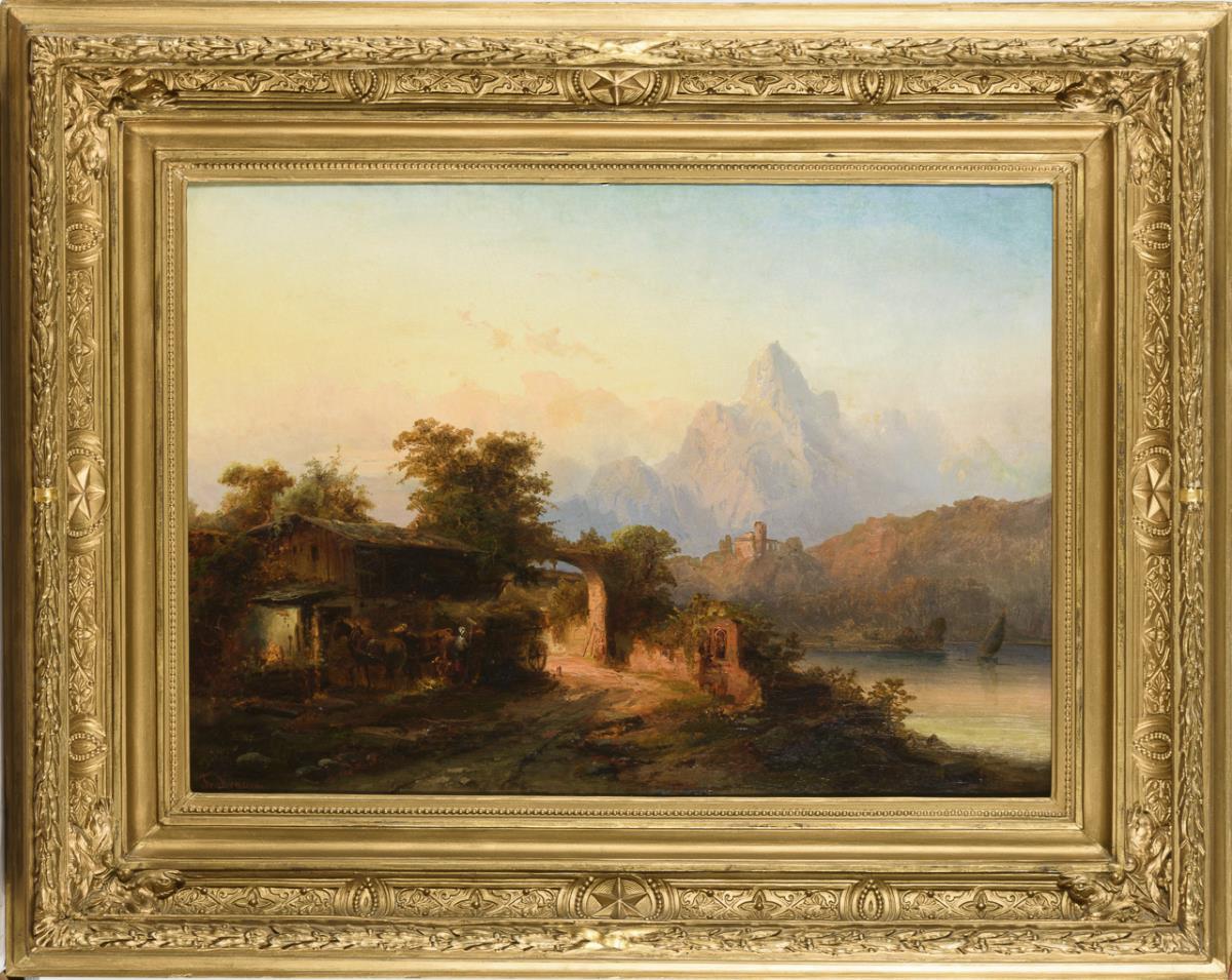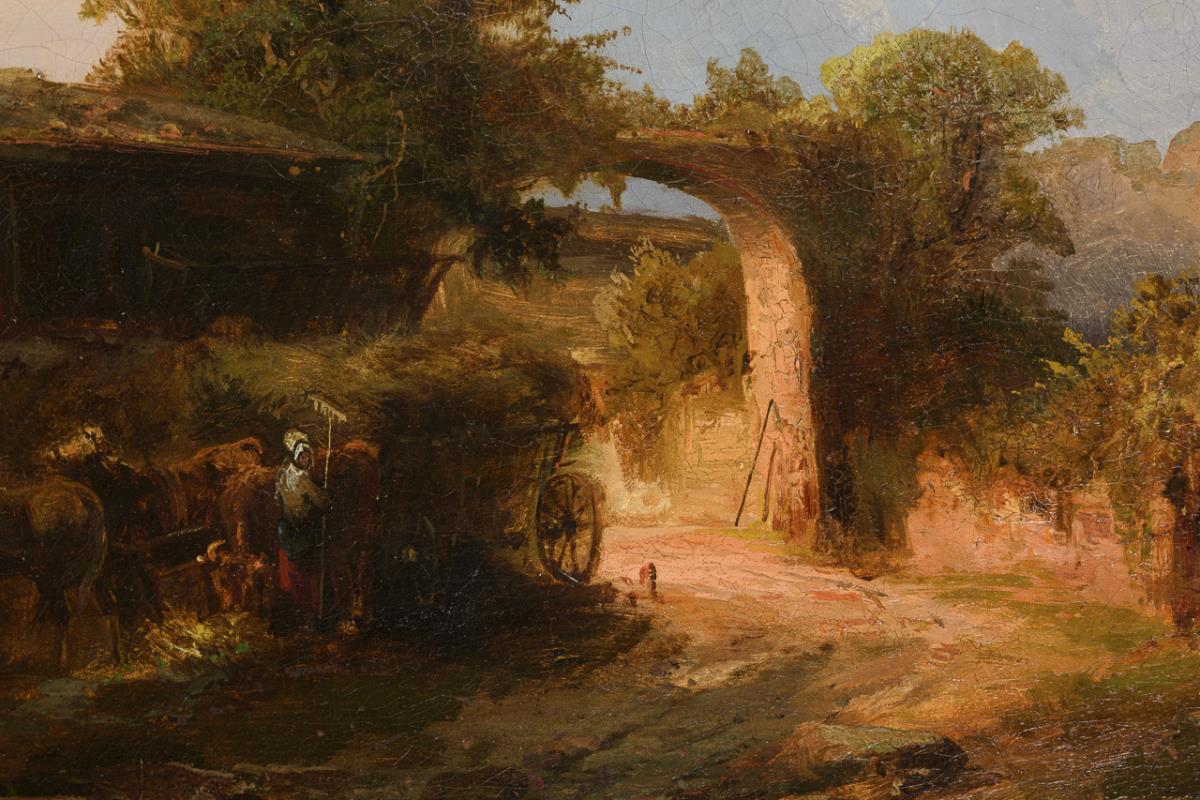 Romantische Landschaft mit Magd am Heuwagen beim Bauernhof nahe dem Seeufer im idyllischen Licht. Altersspuren.