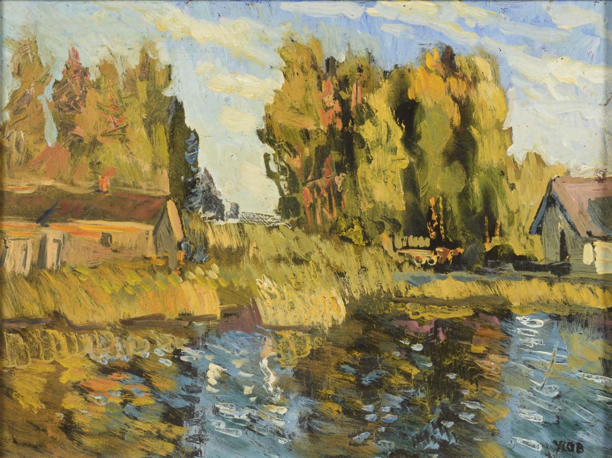 Russischer Maler: Sonnige Dorfansicht mit See