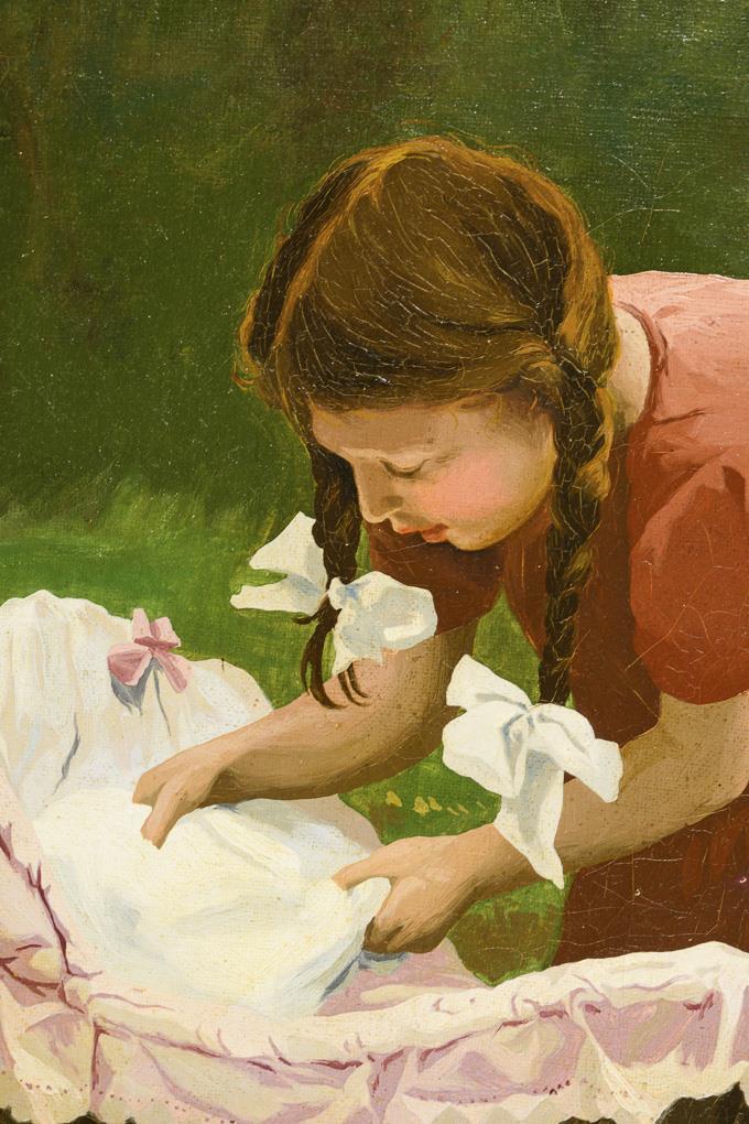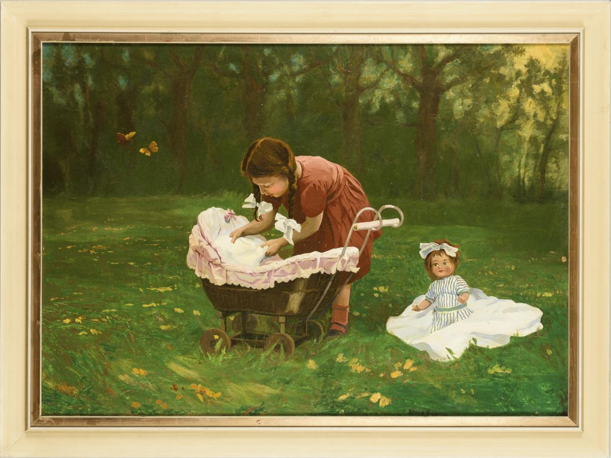 Spielendes Mädchen auf blühender Wiese mit dem Wagen und der Puppe. Minimale Altersspuren.
