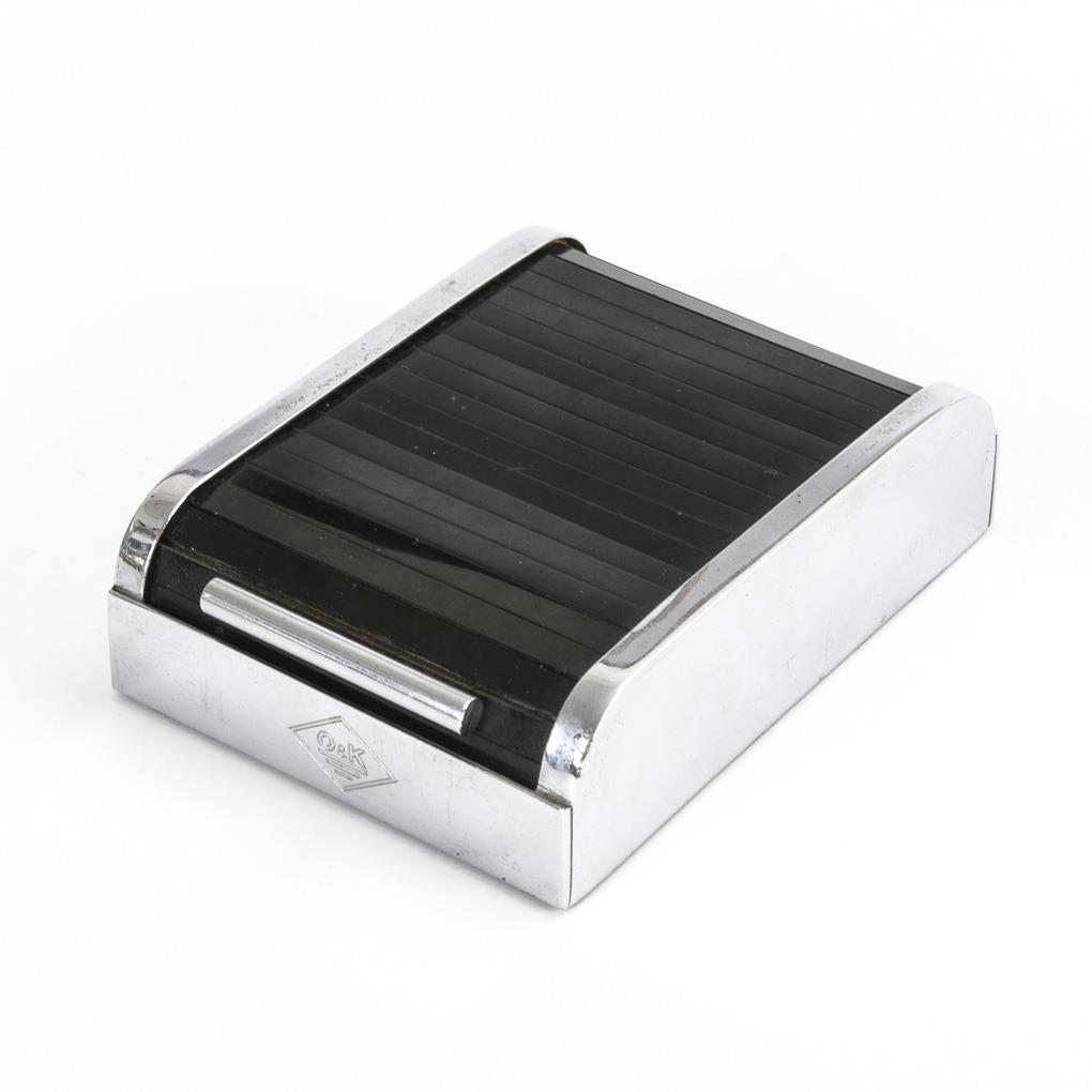 Oblonge Design-Schatulle mit Rolltop-Verschluss; in der Front das geprägtes Monogramm "O&K" (Orenstein & Koppel). Kaum Alters-/Gebrauchsspuren.