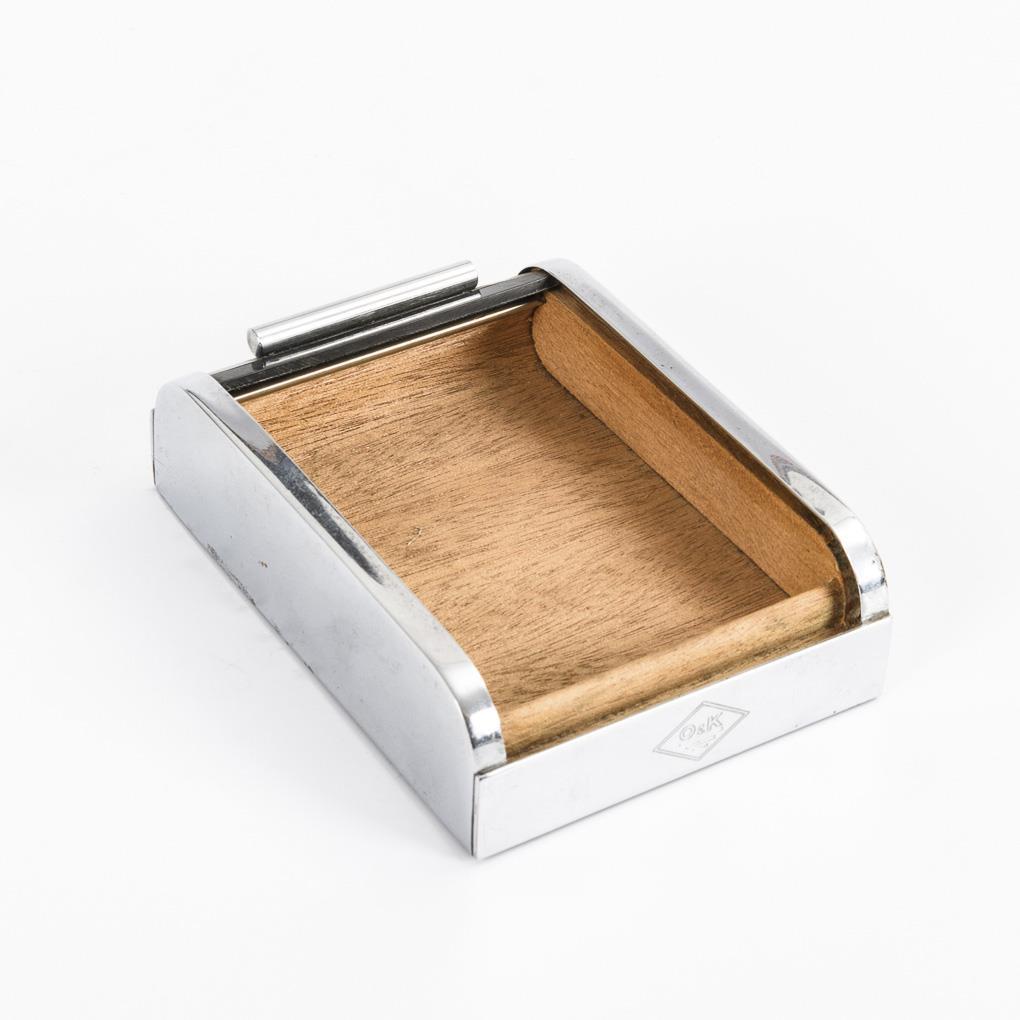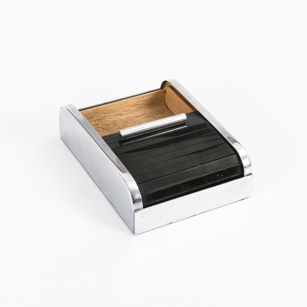 Verchromtes Metall, schwarz lackierte Jalousie, innen Zedernholz, Standfläche mit schwarzem Filz. 3,5 x 12 x 9 cm.