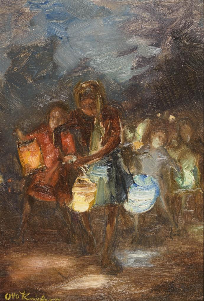 Abstrakte Darstellung der vielen Kinder mit bunt leuchtenden Laternen im Dunkeln.