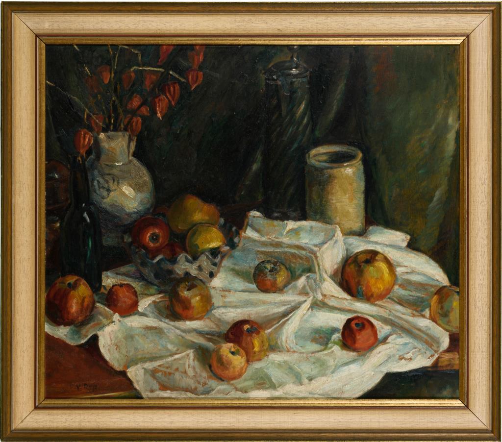 Äpfel auf weißem Tuch neben Schale, Zinnkrug und Vase.