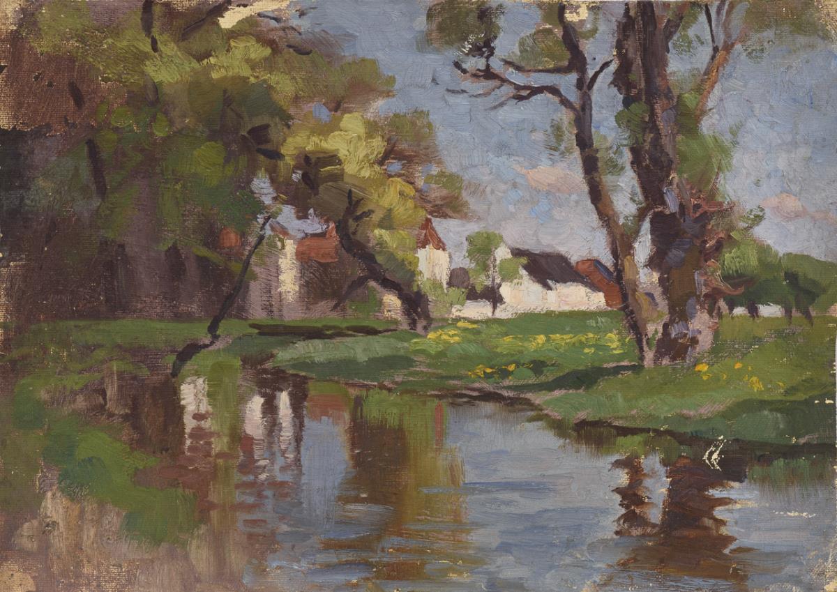 Impressionistisch gemalte Flussbiegung mit Ortschaft im Sonnenschein. Kleine Löcher in den Ecken.