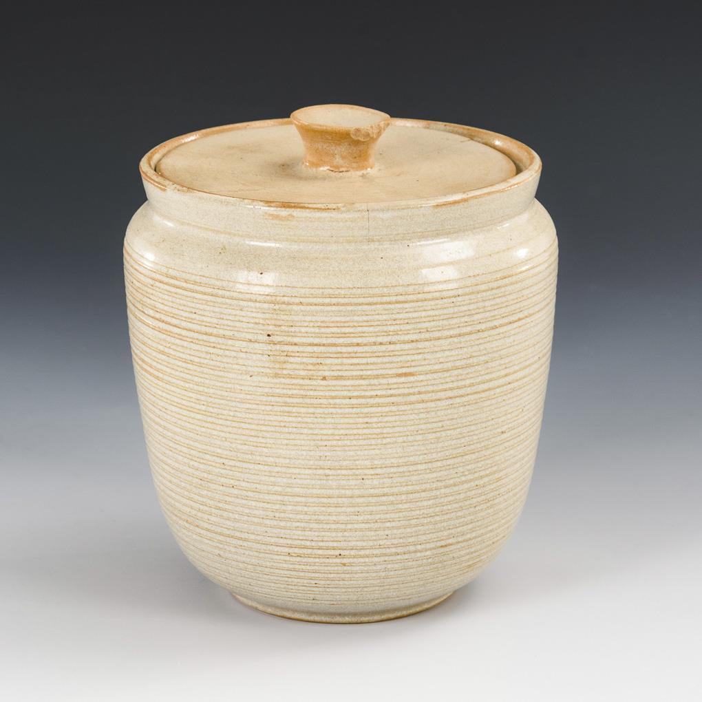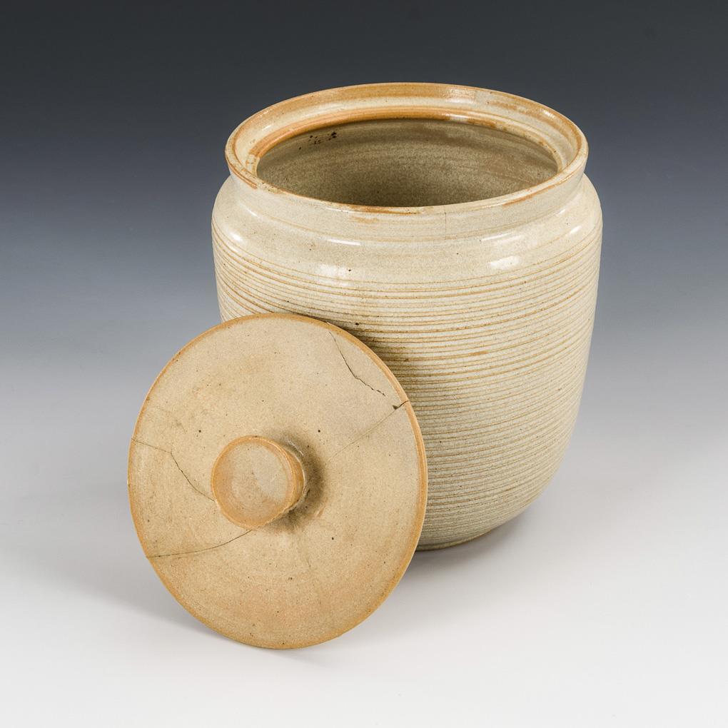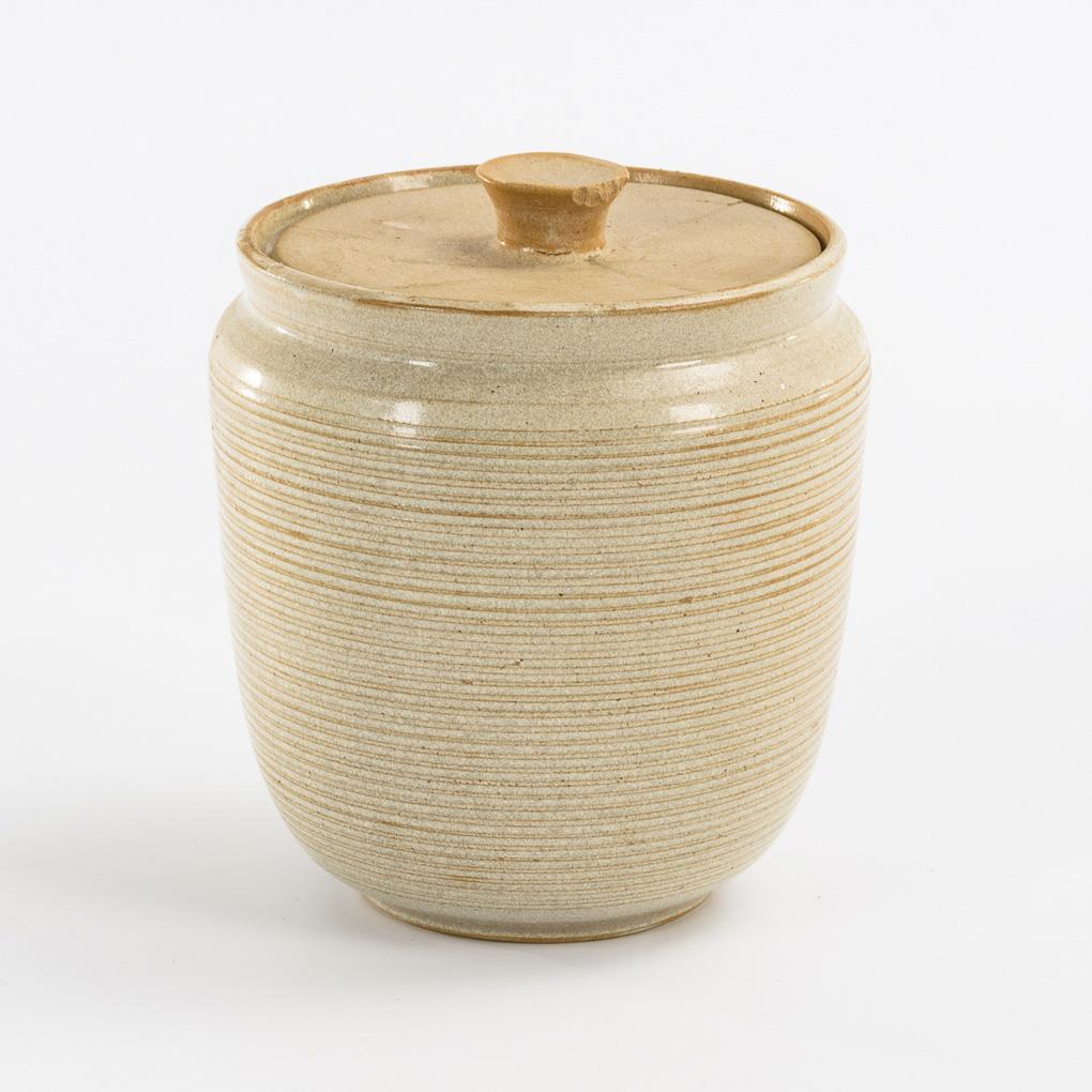 Leicht konische Zylinderform mit feingerillter Wandung, flacher Deckel mit Knauf. Deckel gebrochen und geklebt, Knauf bestoßen, Haarriss am Gefäßrand.