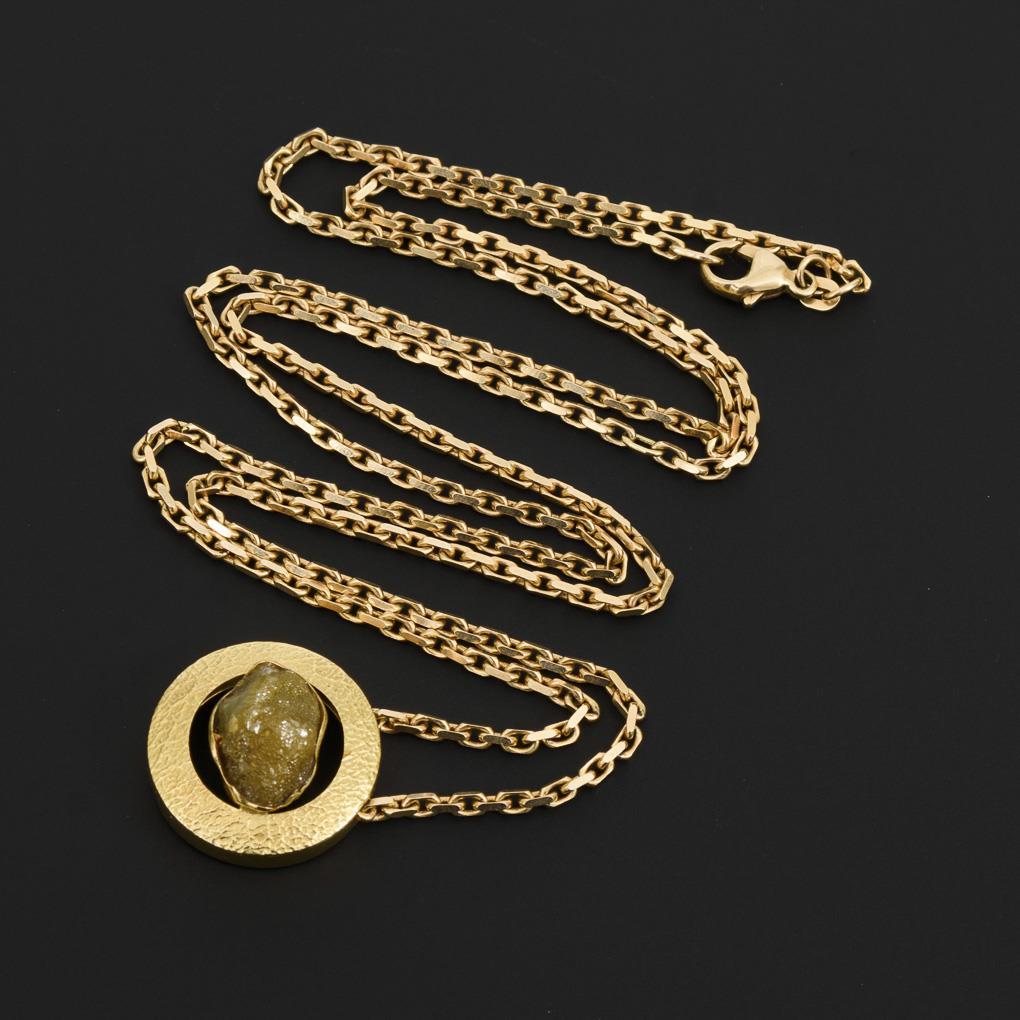 Ungeschliffener, gelblicher Diamant in geschlossener Zargenfassung, an massiver Ankerkette mit