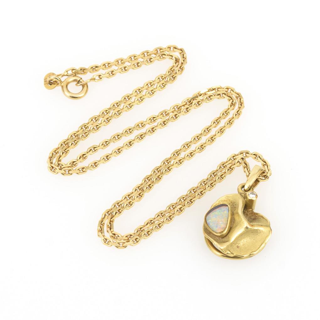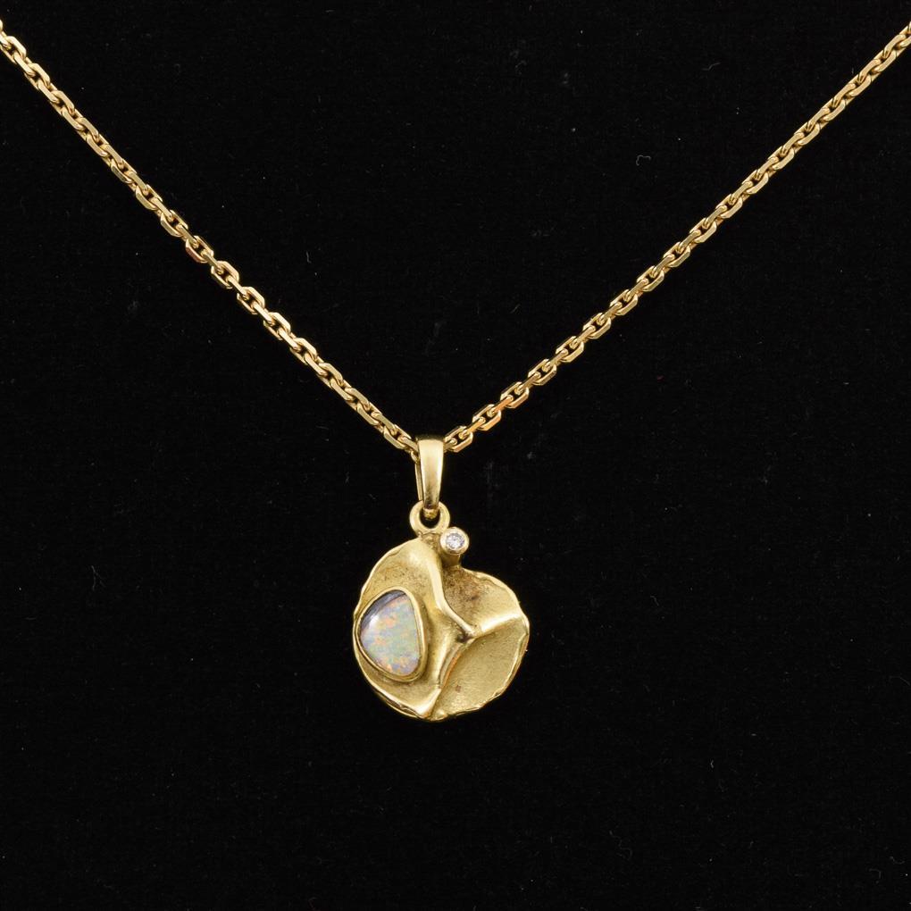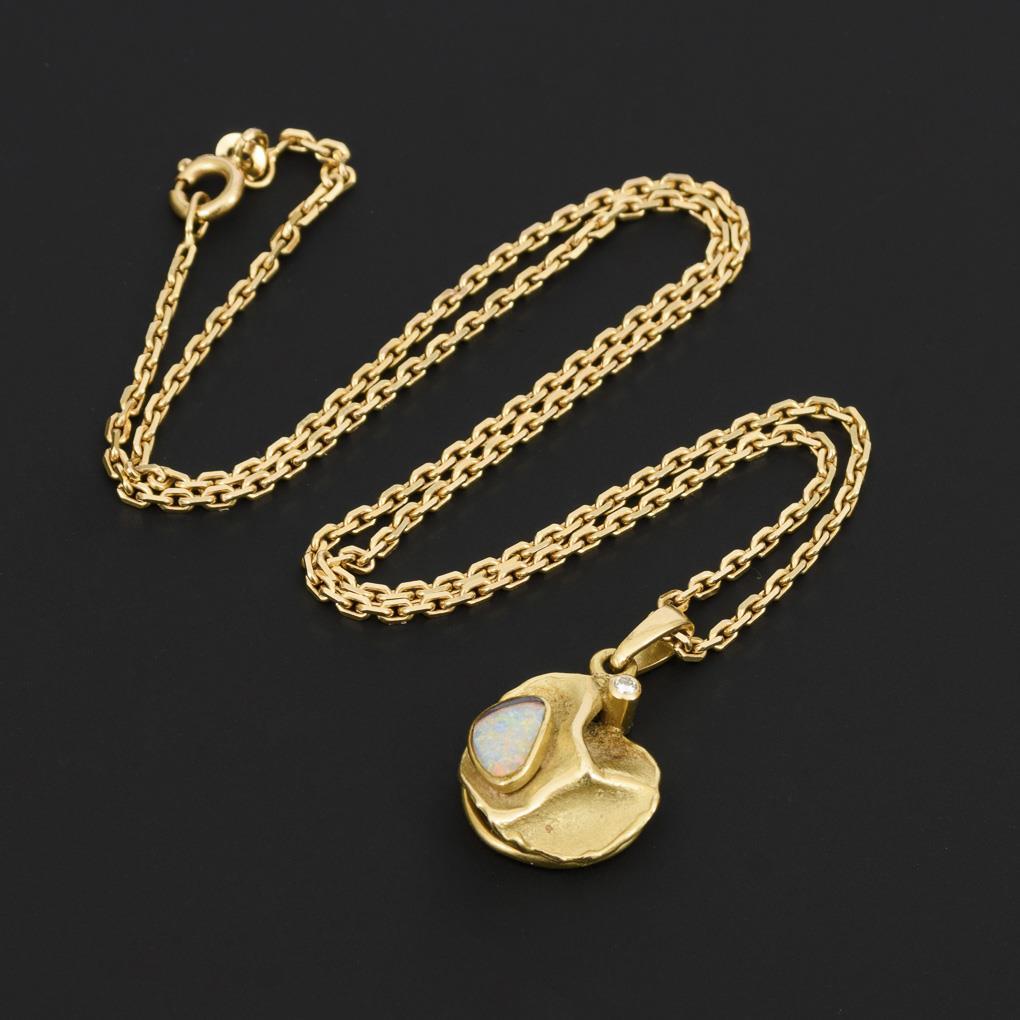 Moderner Anhänger mit Opal und Brillant an Kette.
