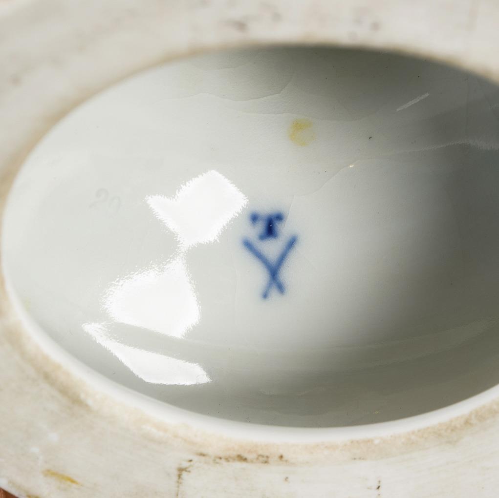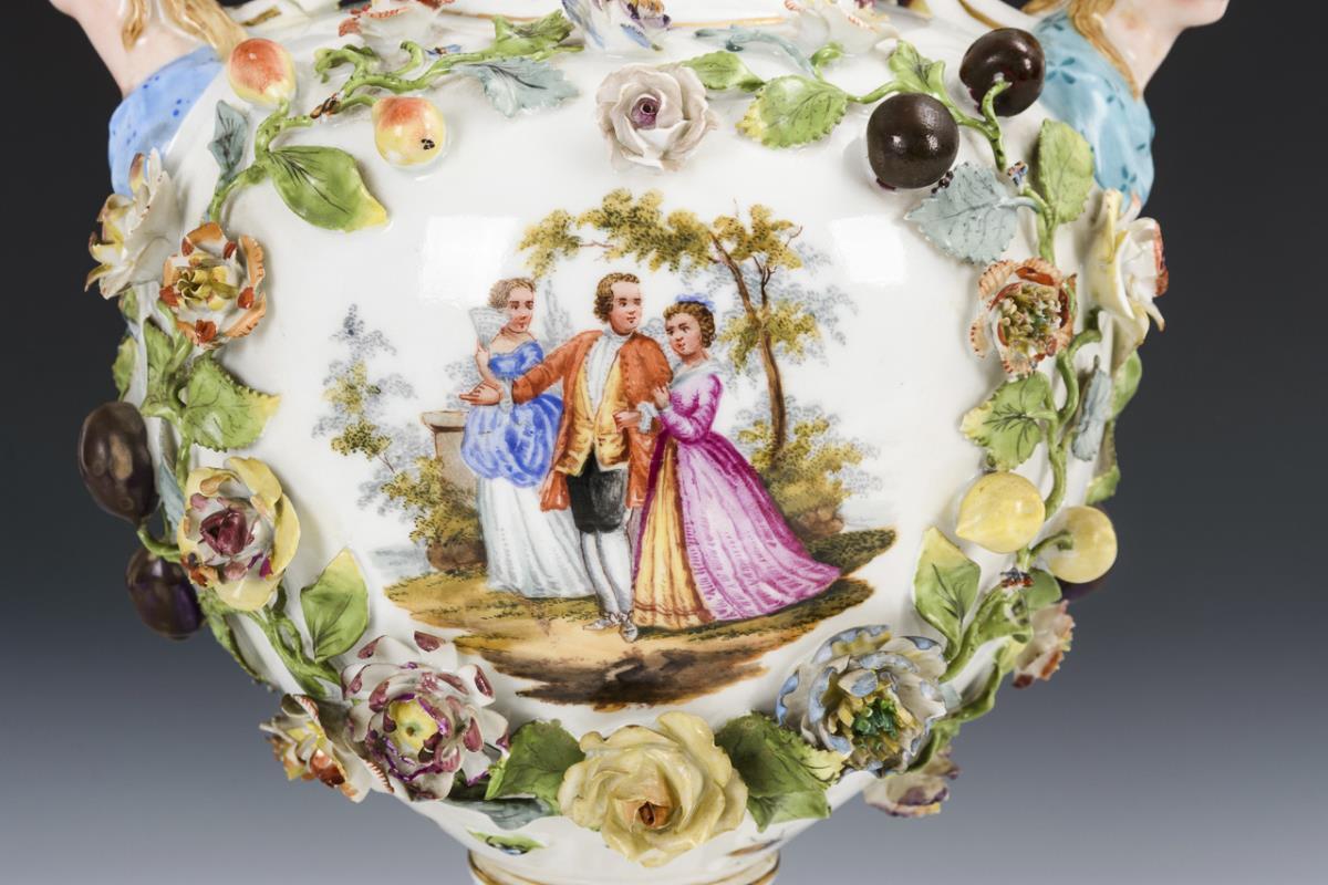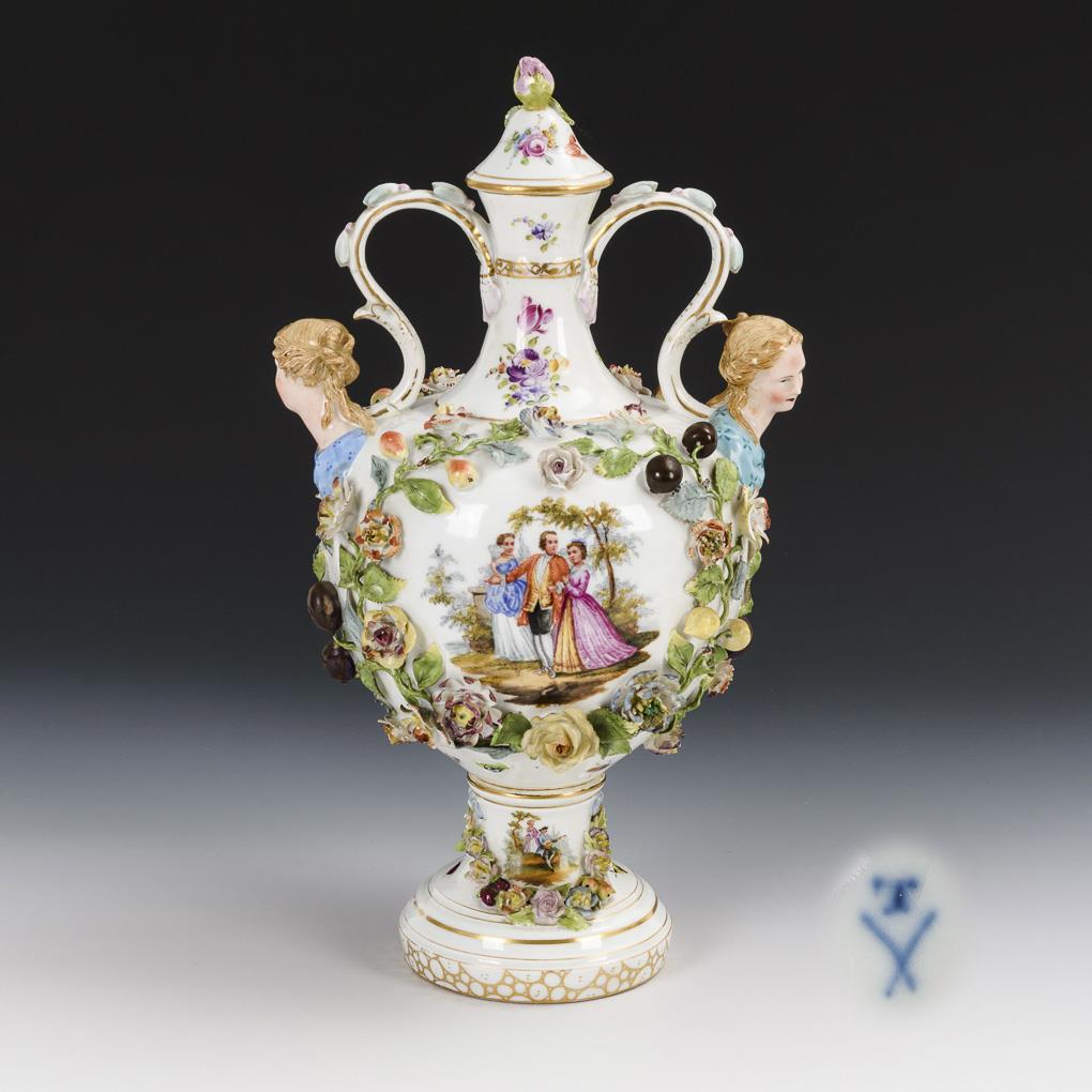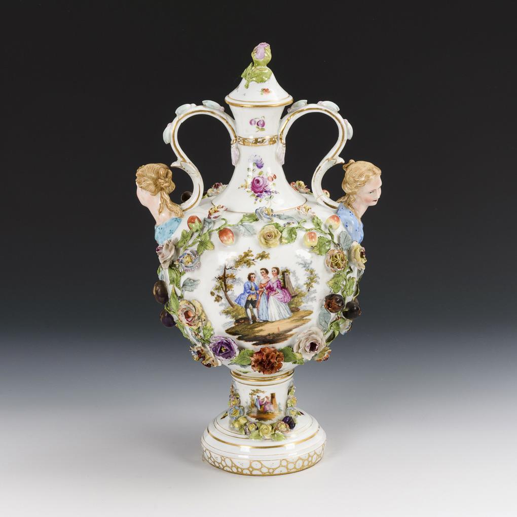 Kugeliger Korpus mit zwei Frauenkopfhandhaben, zwei Henkeln, Rosenknaufdeckel und Rundfuß. Beidseitig ein großer, aufgelegter Frucht- und Blütenkranz mit einer Watteauszene. Deckelknauf und beide Henkel geklebt, Bestoßungen am Belag, Glasur partiell krakeliert.
