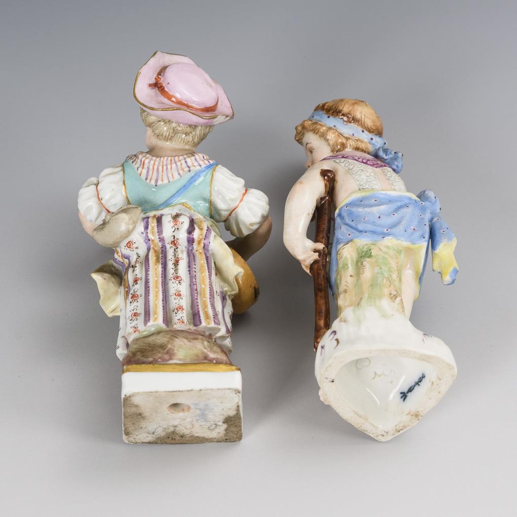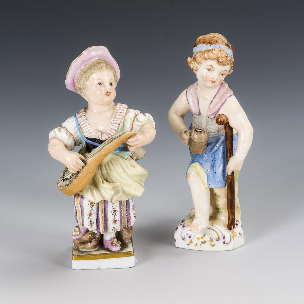 1x KPM Berlin, 1. H. 20. Jh.: auf einen Krückstock gestützter Putto mit Spardose. / 1x Meissen, um 1750: Gärtnerkind mit Mandoline. Defekt.
