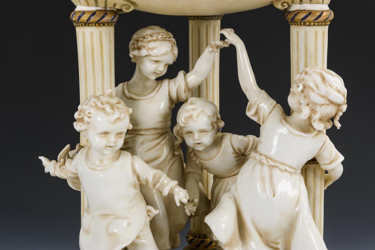 Puttenreliefierte, von drei Säulen getragene Schale, um die Säule vier, einen Reigen tanzende Kinder. Partieller Goldabrieb, 3 minimale Randbestoßungen, Blumensträußchen in der Hand eines Mädchens bestoßen.