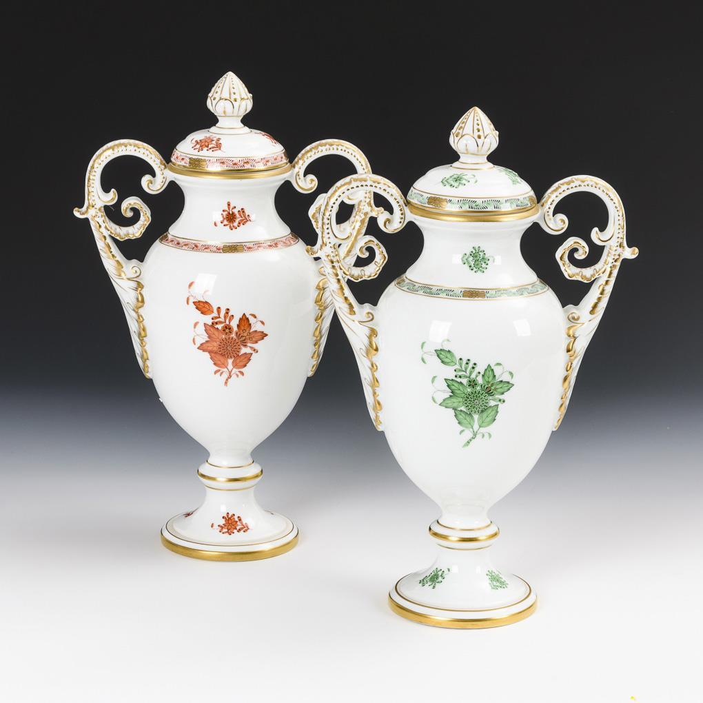 2 ovoide Vase mit Rocaillehenkeln, Knaufdeckel und Rundfuß.