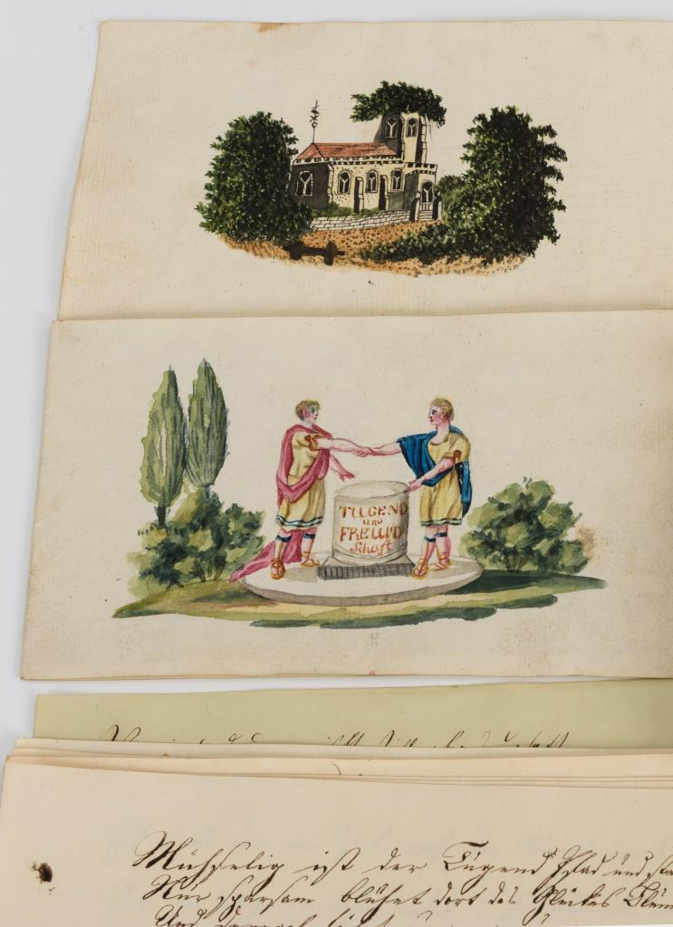 "Liber amicorum" als grüne Papphülle mit Goldprägung "H.H. 1819". Innen ca. 23 Stammbuchblätter (1819 -1844 zumeist Aurich und Bergedorf, darunter 3x mit Aquarell) sowie 4 Luxuspapiere (Farblitografie, teils als Klappbild). Hülle mit starken Alters-/Gebrauchsspuren.