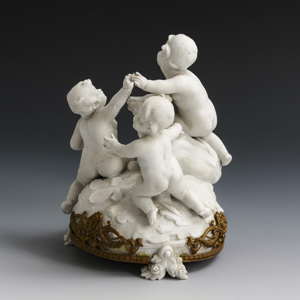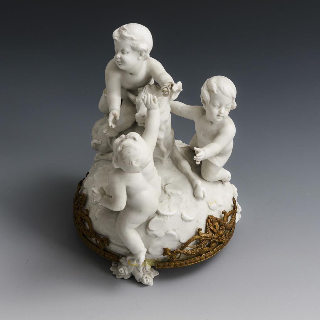 Drei Putten mit Stier auf einem Natursockel. Sockelrand mit einer Bronzemontierung gefasst. Montierung jünger aufgeklebt, Tuch eines Putto, 2 Finger und 1 Blüte bestoßen.