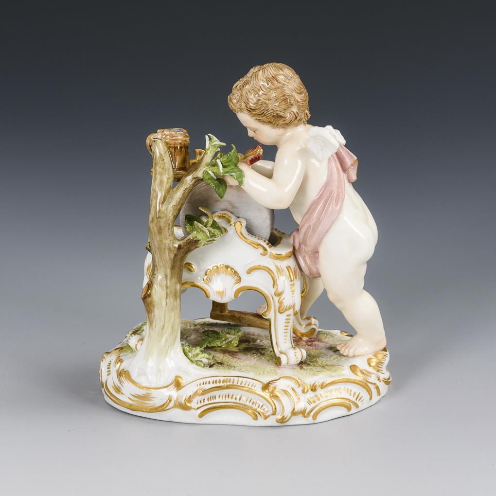 Auf einem Rocaillesockel stehender Amor, seinen Pfeil an einem Schleifstein schärfend, neben ihm ein Bäumchen mit Wasserkrug. Blätter und 1 Ast bestoßen, 1 Puttenflügel fehlt.