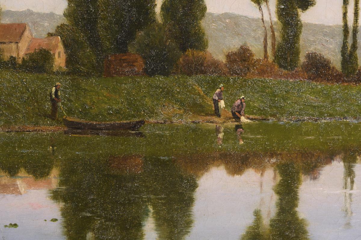 Wäscherinnen am Fluss nahe den Dorfhäusern am Abend. Eine restaurierte Stelle.