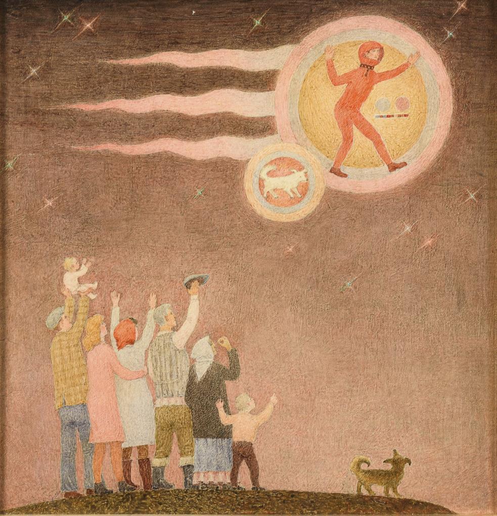 Surrealistische Genreszene mit Kosmonaut und Hündin im Himmel sowie einer Familie, welche beiden zuwinkt.