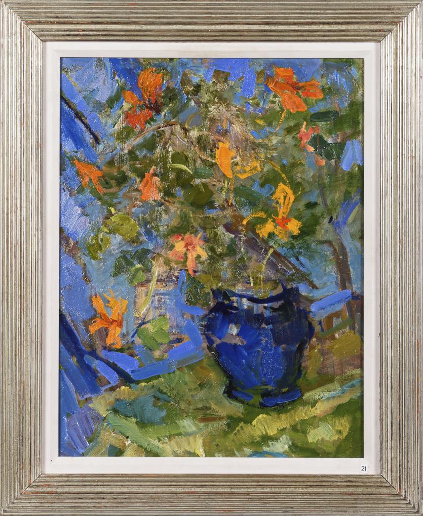 Expressiv und farbenfroh gemalter Blumenstrauß in blauer Vase.