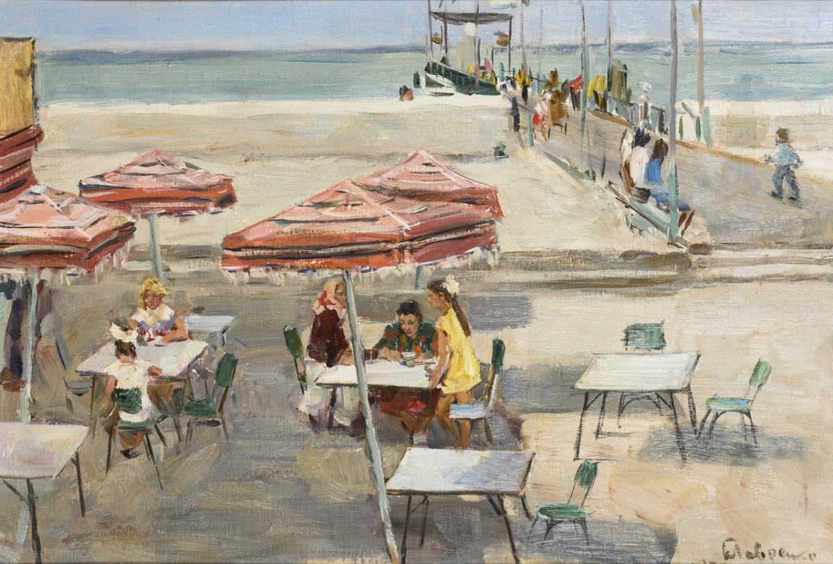Mehrere Personen im Strand-Café an einem hellen Tag.