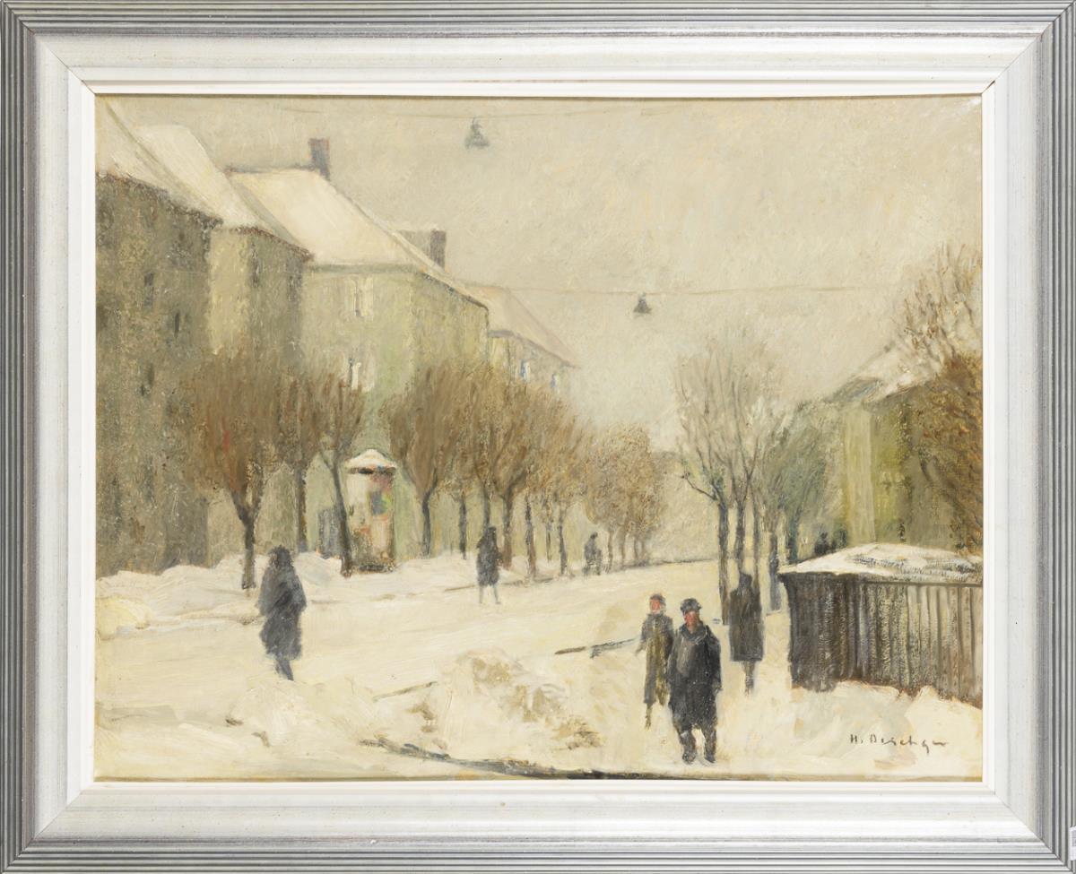 Verschneite Stadtszenerie mit Staffagefigur unter grauem Himmel. Minimale Altersspuren.