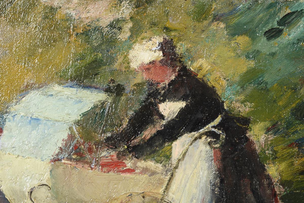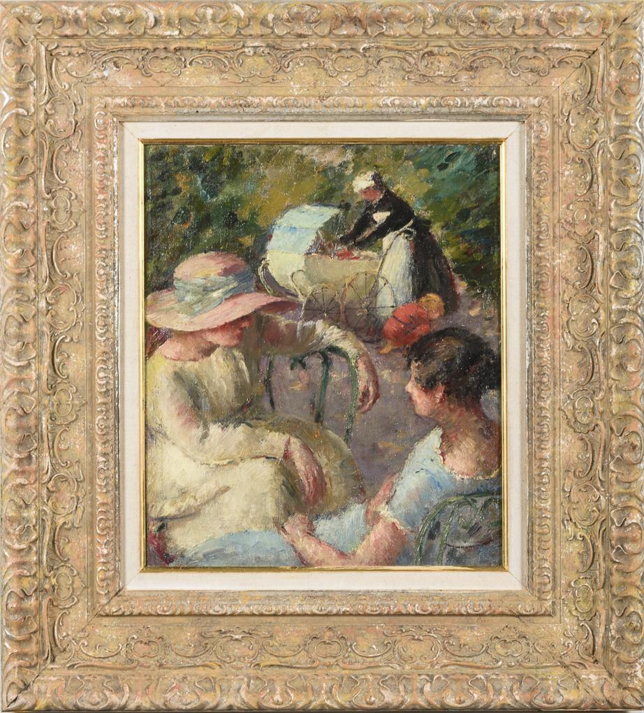 Zwei Frauen im Gespräch im Freien mit der Dienstmagd am Kinderwagen weiter hinten.