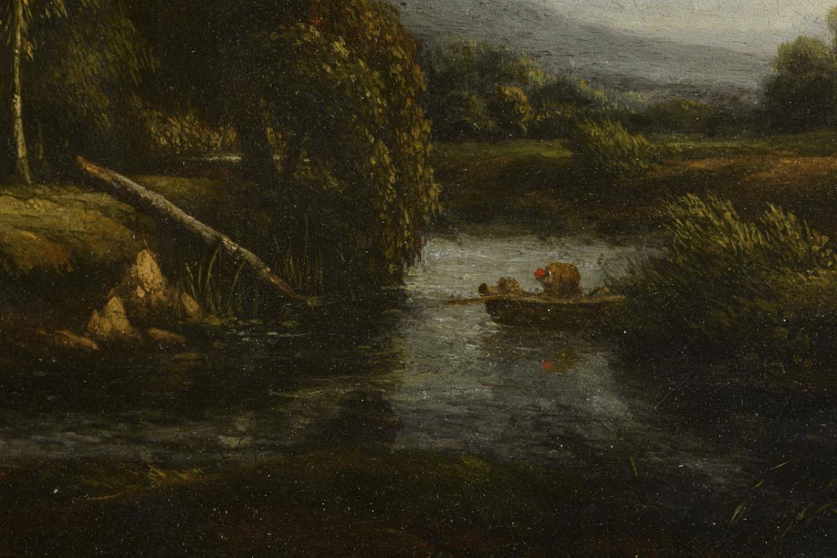 Vieh am Waldrand nahe dem Flussufer mit dem Kahnfahrer. Leichte Altersspuren.