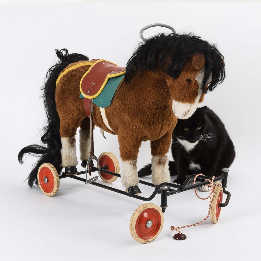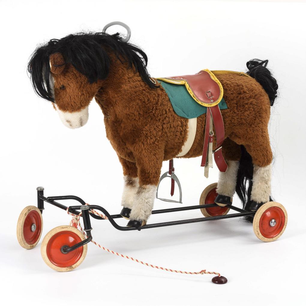 Fuchspony mit Zugschnur, Zugstimme und Sattel. Auf Eisengestell mit rot-weißen Eisenrädern. Altersspuren, 1 Steigbügel fehlt, 1 Steigbügelriemen gerissen.
