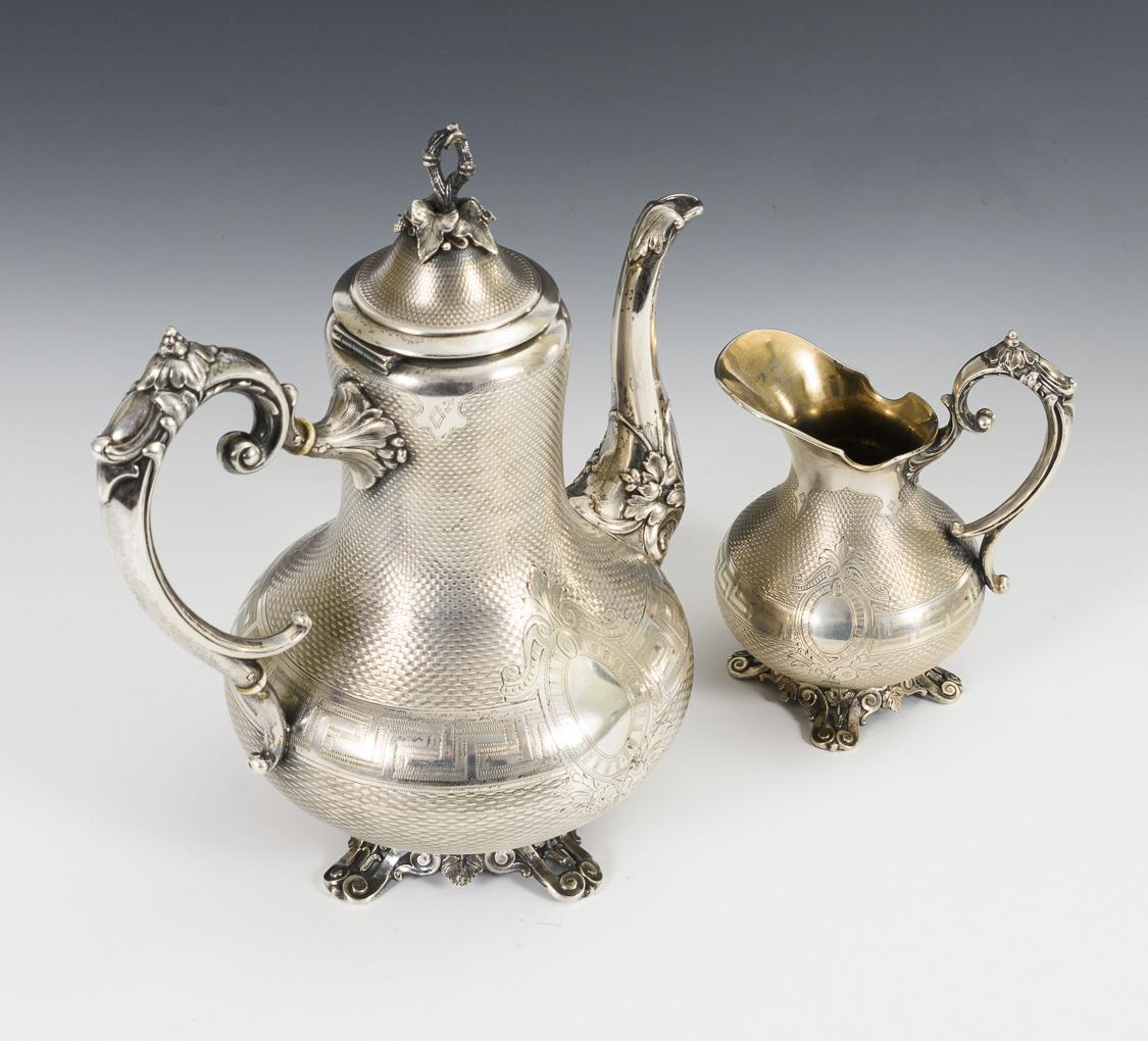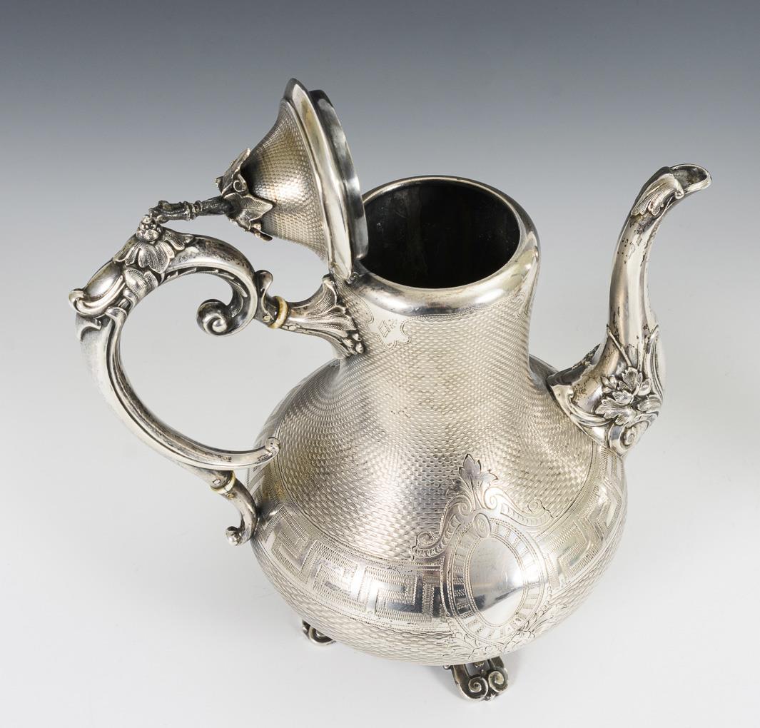 Reich verziert mit Guillochedekor und Mäanderband. Leicht gedellt.