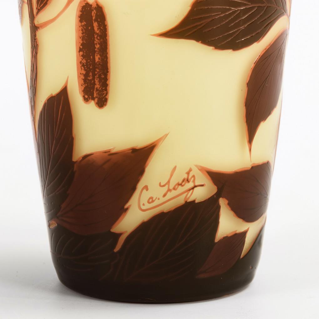 Balustervase mit umlaufend geätztem Blattdekor mit einem blühenden Birkenzweig und einem Schmetterling.