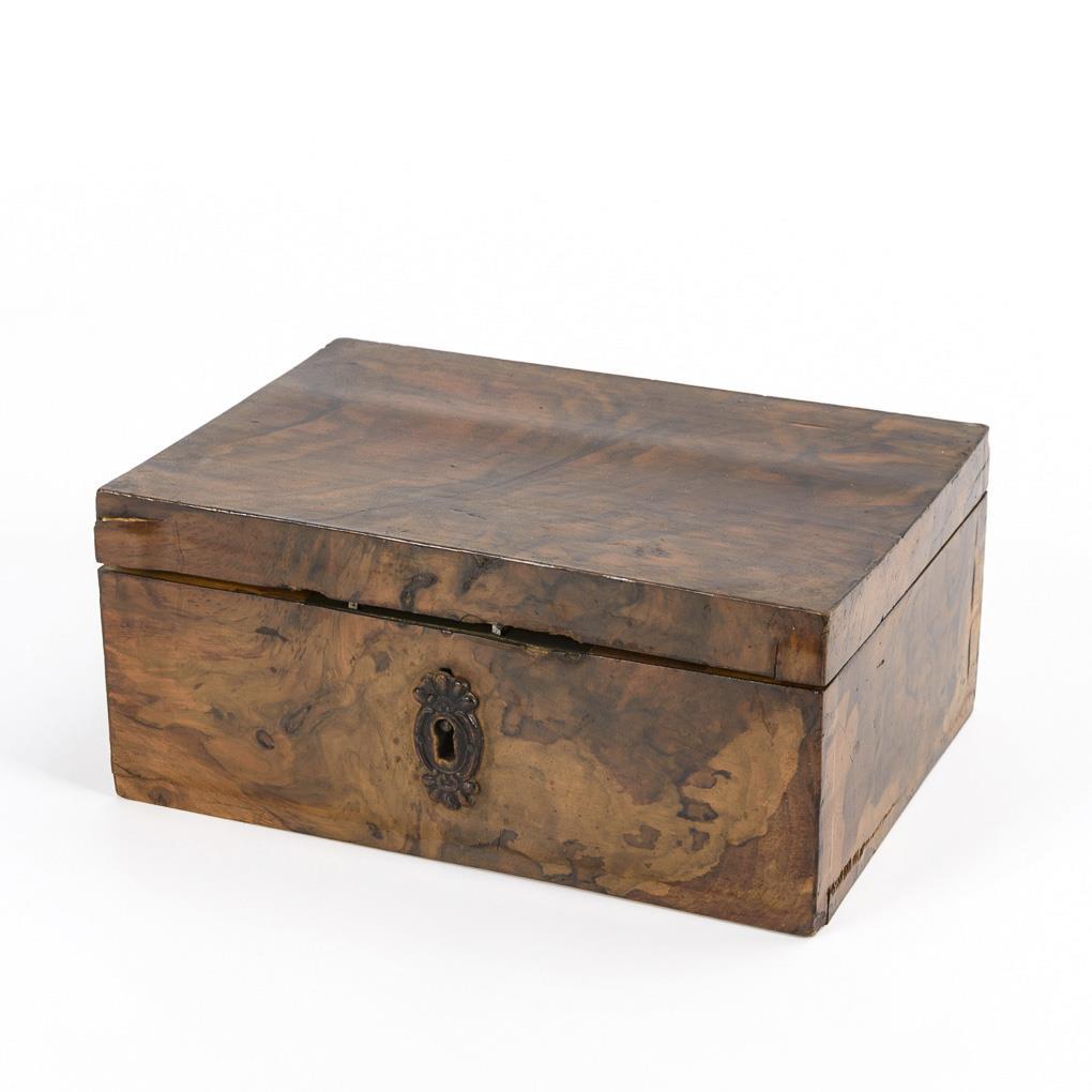 Rechteckiger Korpus, im Innendeckel jüngerer Spiegel. Innen zwei fest eingebaute Schübe und fünffach gegliederter Einsatz. Einige Furnierschäden und leichte Trockenrisse.