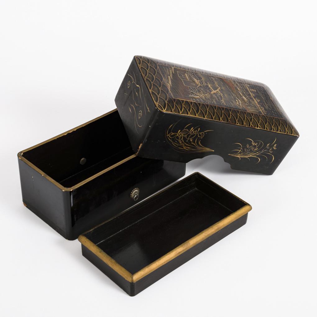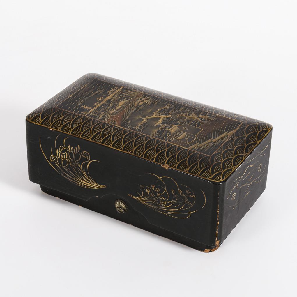 Rechteckiger Korpus mit Einsatz. Auf Deckel Landschaft mit See und Fuji, eingefasst in Wellenornament. Seitendekoration mit dezenten Blumenmotiven. Alters- und Gebrauchsspuren.