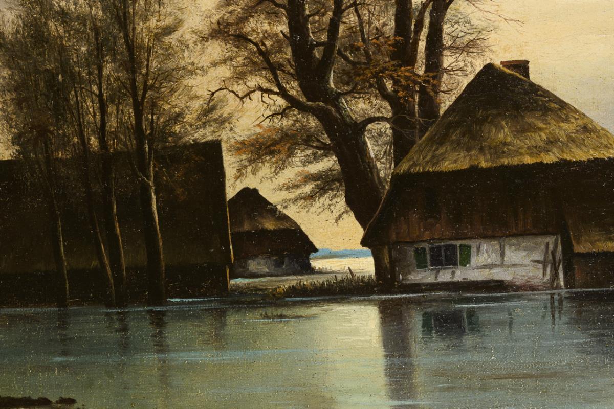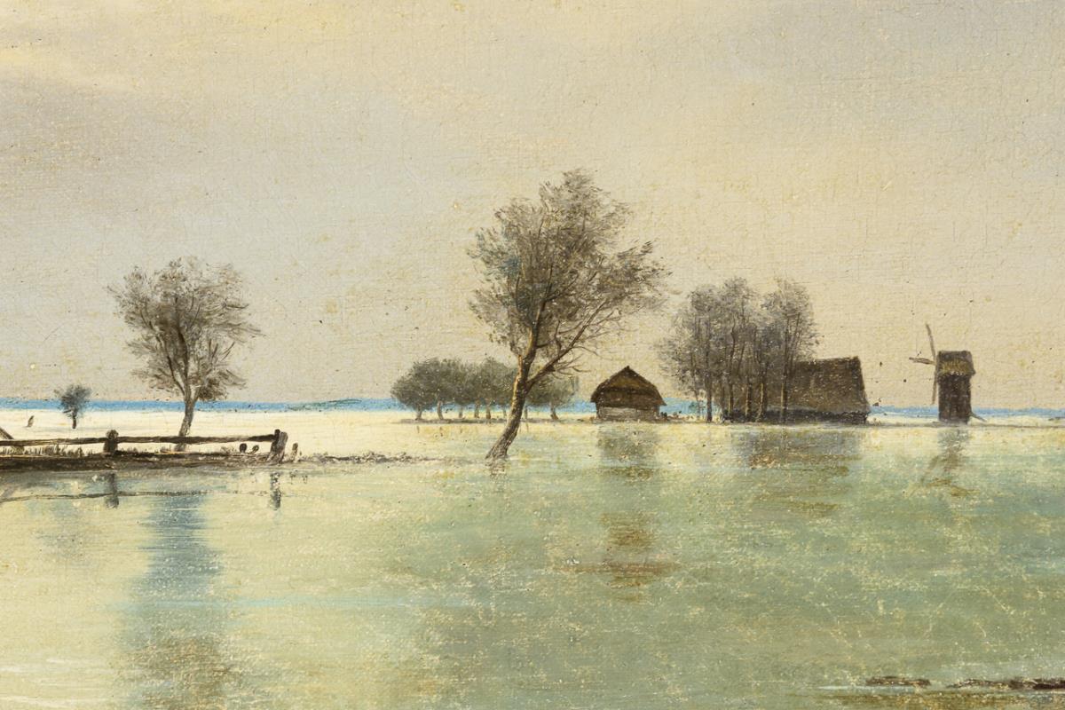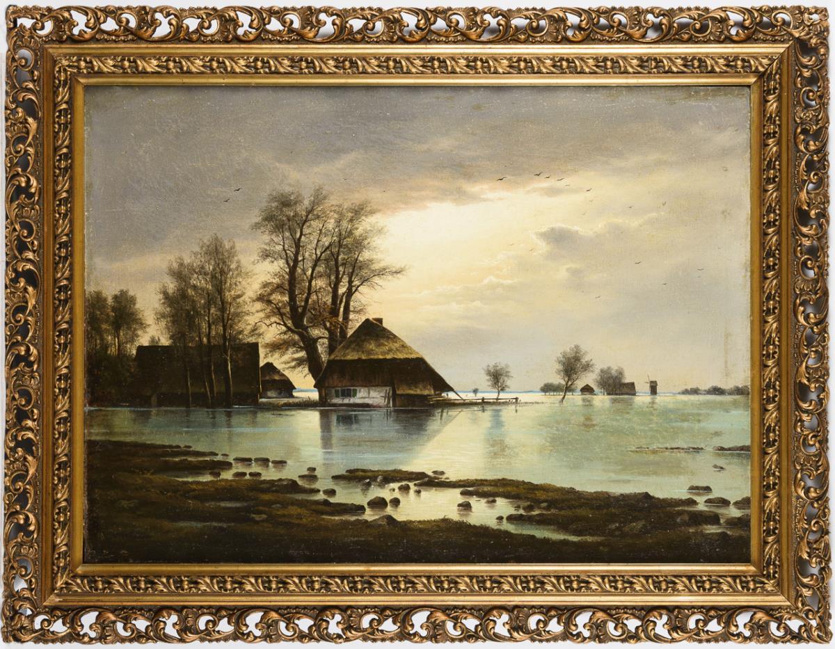 Die bekannte Hochwasserszene mit den Gehöften in weiter, flacher Landschaft. Zwei kleine restaurierte Stellen mit Hinterklebungen.