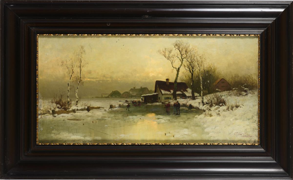 Staffagefiguren auf dem gefrorenen Fluss in weiter verschneiter Dorflandschaft. Altersspuren.