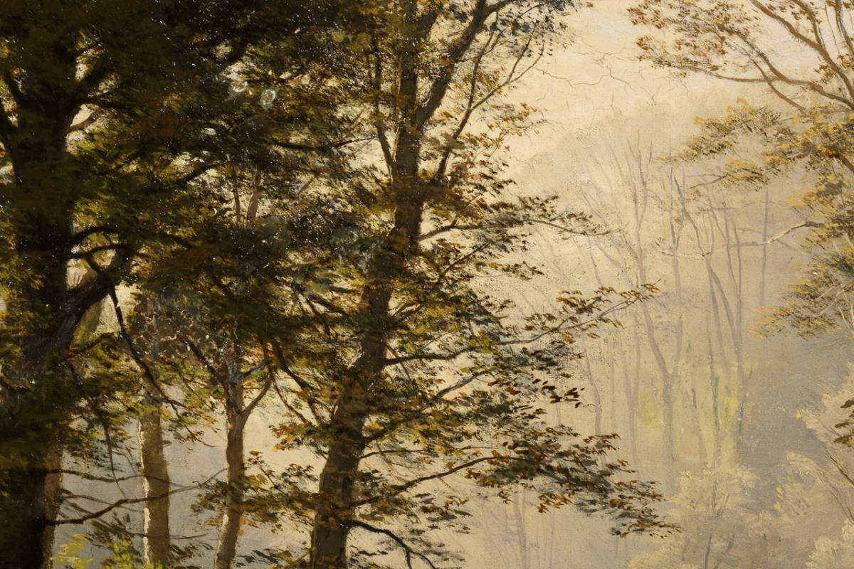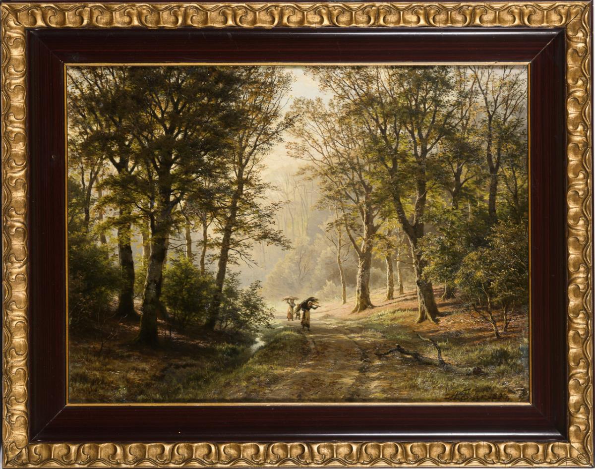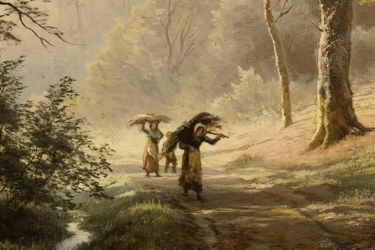 Staffagefiguren auf der Waldstraße bei einfallendem Sonnenlicht durch die Baumkronen. Eine kleine restaurierte Stelle mit Hinterklebung.