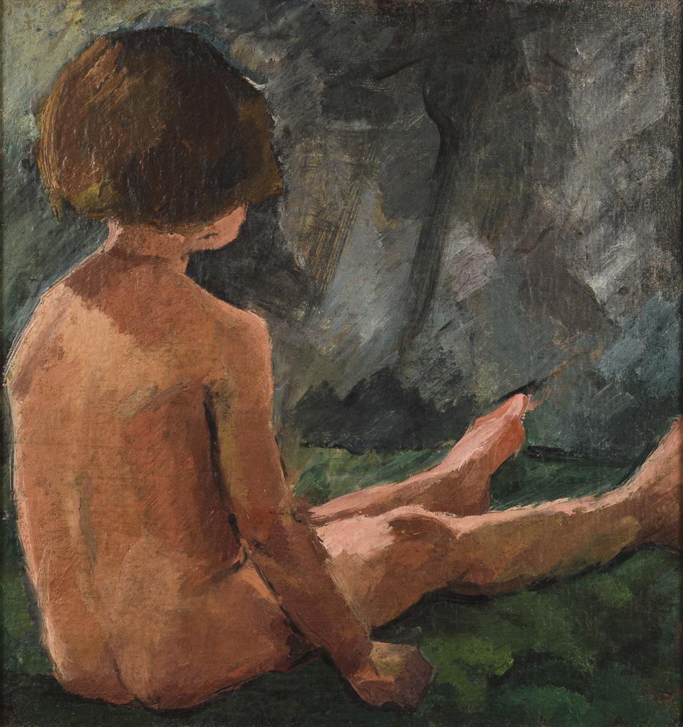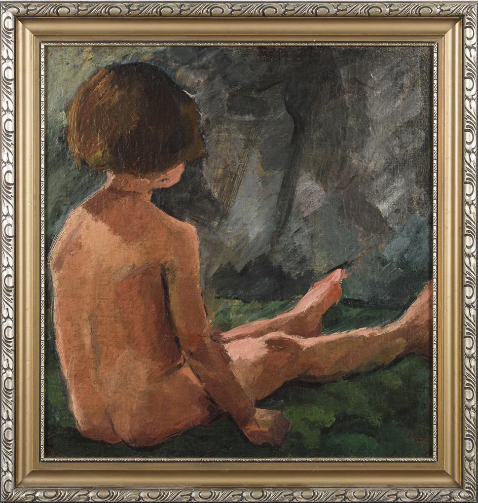 Nackt im Gras sitzendes Kind.