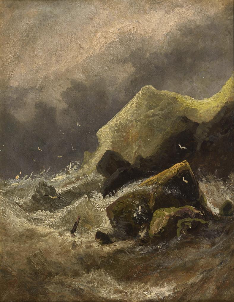 Hohe, brechende Wellen an scharfkantigen Felsen unter dunklem Wolkenhimmel. Leichte Altersspuren.