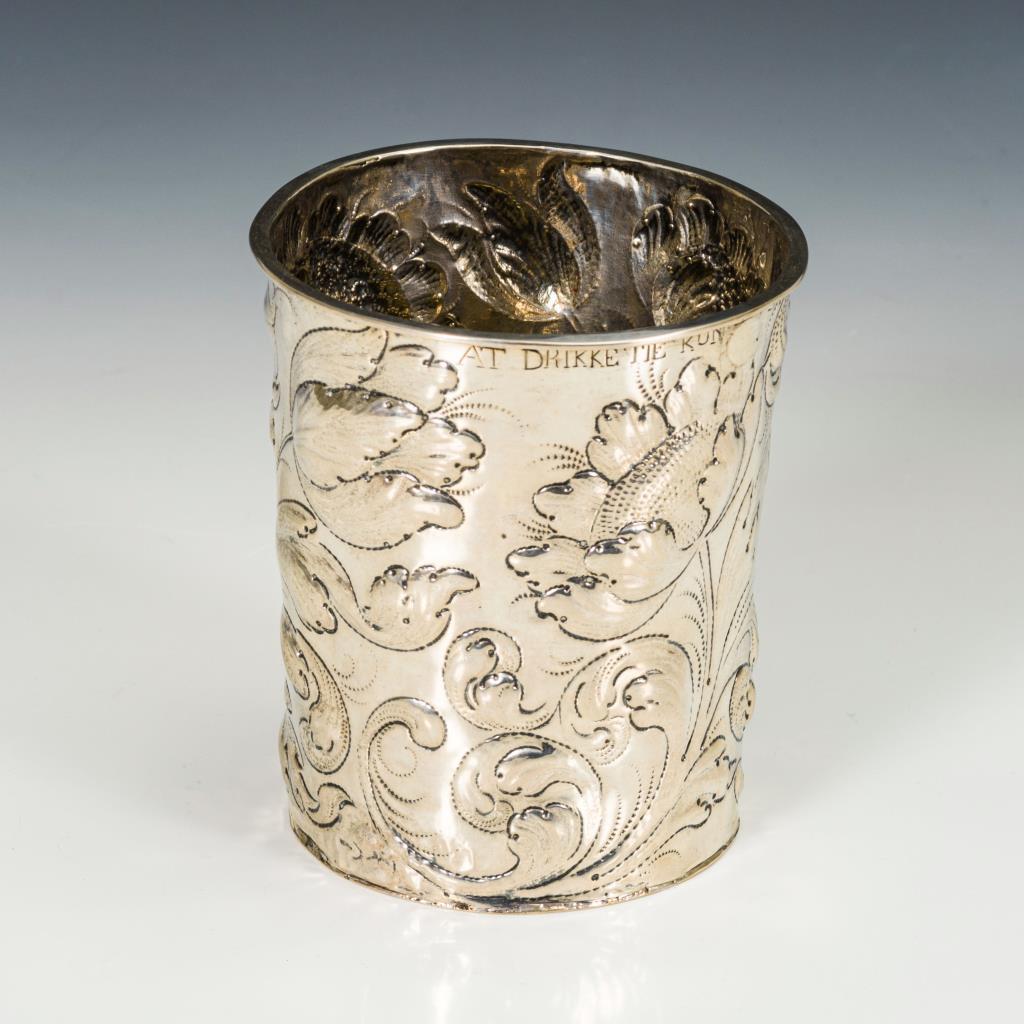 Floral reliefierter Becher, mit Gravur in norwegischer Sprache. Boden und Mündungsrand ergänzt.