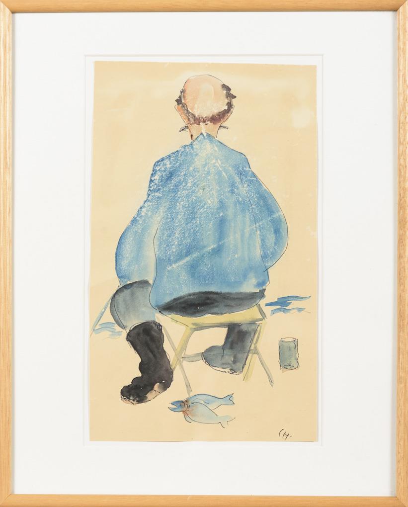 Rückenbildnis eines Mannes am Fluss mit den Fischen unter dem Stuhl.