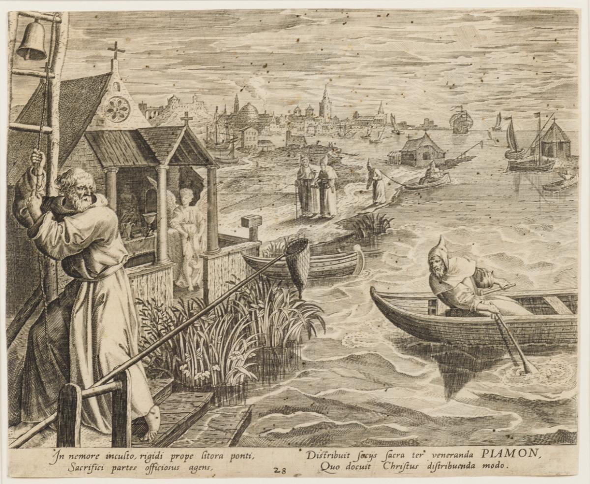 Blatt 28: Piamon Diovles als Eremit, bezeichnet "In nemore inculto, rigidi prope sitora ponti, Sacrifici partes officiosus agens, [...]". Beschnitten, etwas stockfleckig.