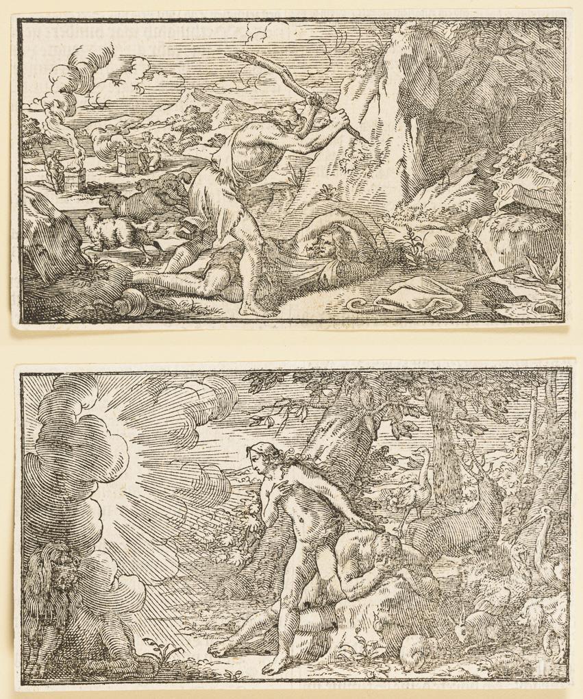 2 Buchholzschnitte: "Der Sündenfall" | "Kain erschlägt Abel"