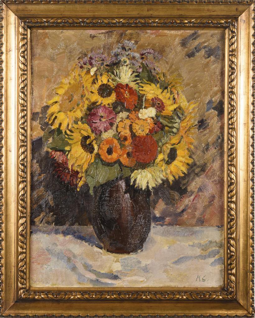 Großer Blumenstrauß aus verschiedenen Sommerblumen in dunkler Vase. Minimale Altersspuren.
