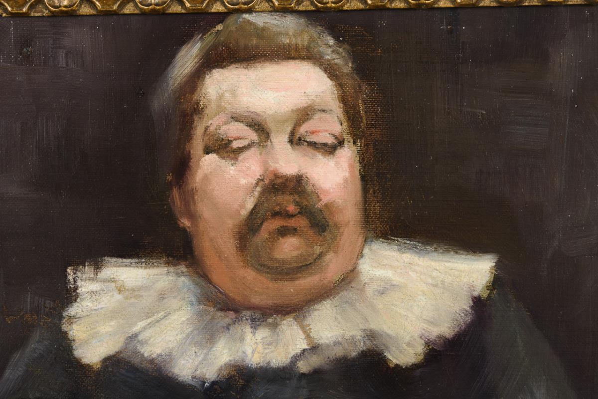 Malende Damen vor einem männlichen Modell mit Shakespearekrause. Minimale Altersspuren.